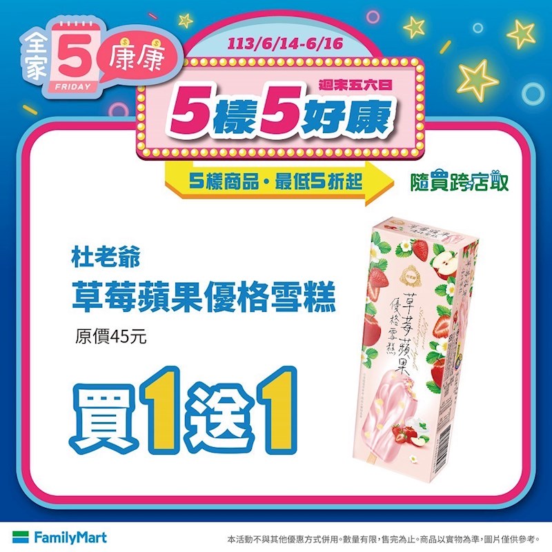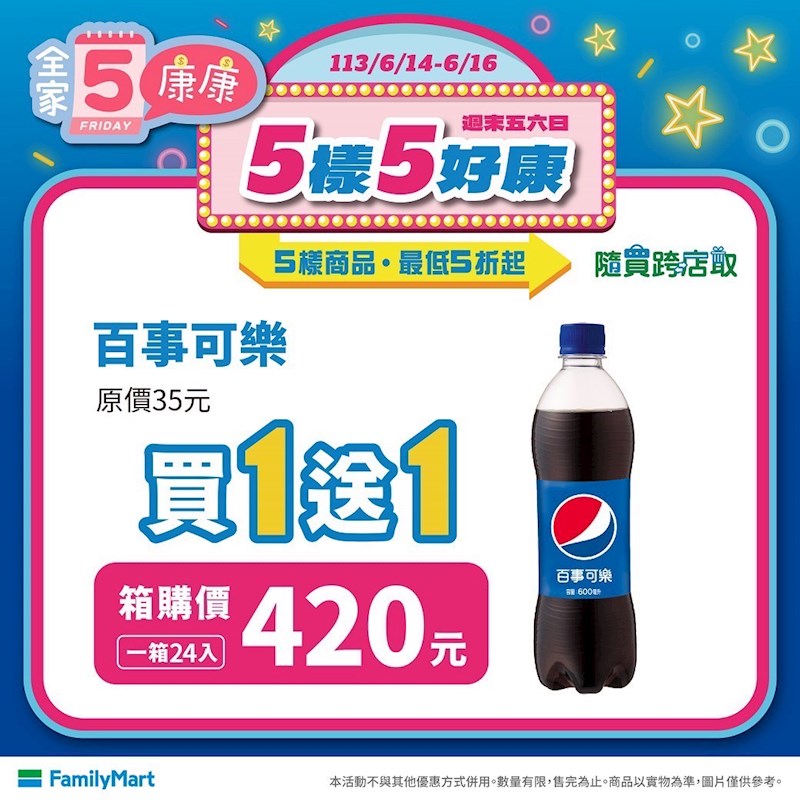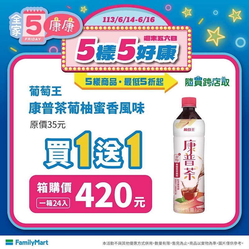 終於等到!全家超夯「康康五」活動重磅回歸,從6月14日至6月16日,不僅有人氣Fami!ce霜淇淋買1送1,品嘗最新口味「海鹽檸檬」,還有百事可樂、杜老爺雪糕、葡萄王康普茶等品項也有買1送1,部分商品還能隨買跨店取,省錢又能囤貨吃一波~