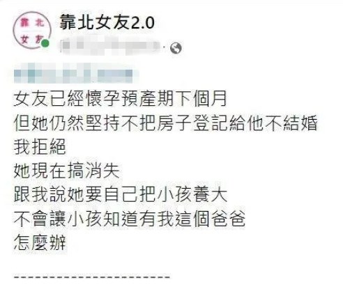 日前一名男網友在「靠北女友2.0」發文透露,懷孕的女友下個月就是預產期,但卻堅持不把房子過戶,就不跟原po結婚,「她現在搞消失,跟我說她要自己把小孩養大,不會讓小孩知道有我這個爸爸,怎麼辦?」