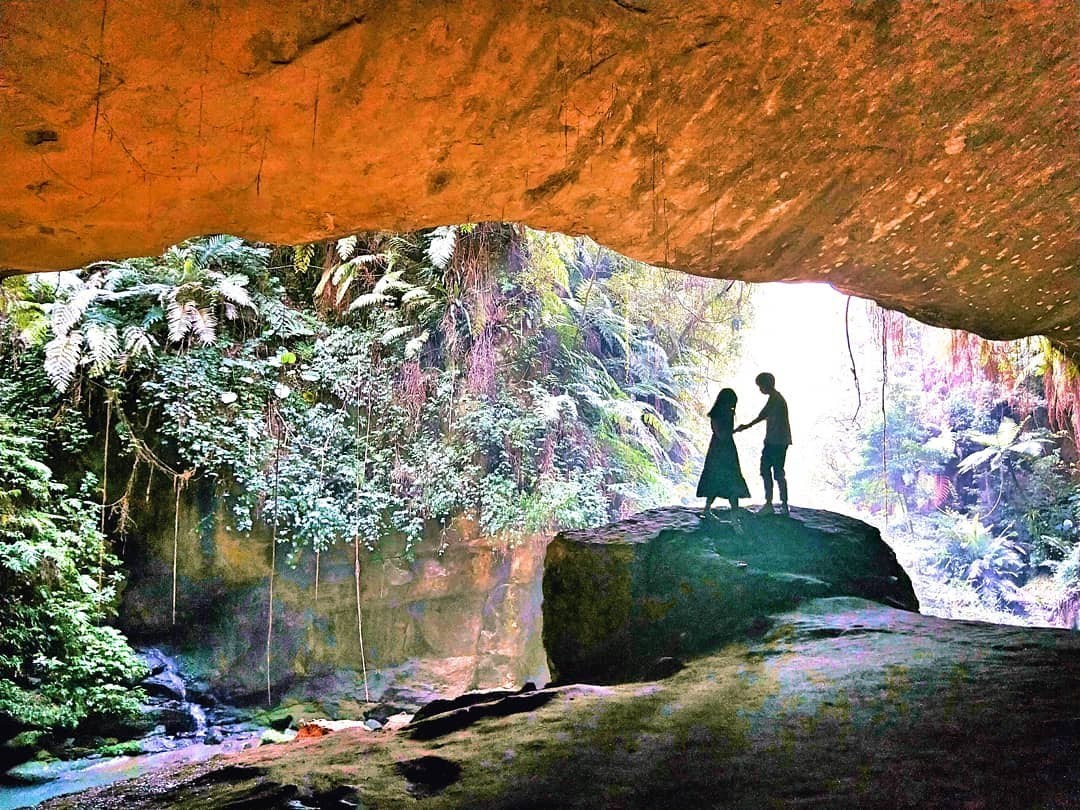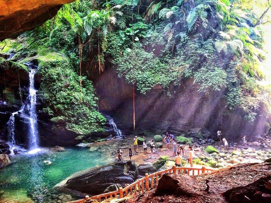 ▲雖然蝙蝠洞已經沒有蝙蝠,但彎月形的壯觀洞窟以及瀑布與翠綠溪流,吸引許多人前來朝聖