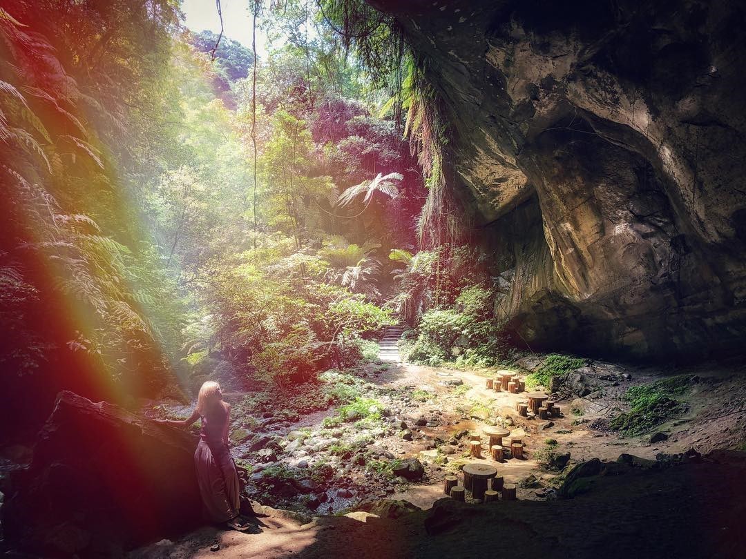 ▲陰暗的洞窟裡,天上開了一個窗,陽光灑落,一旁瀑布緩緩流下,有如國外風景景觀