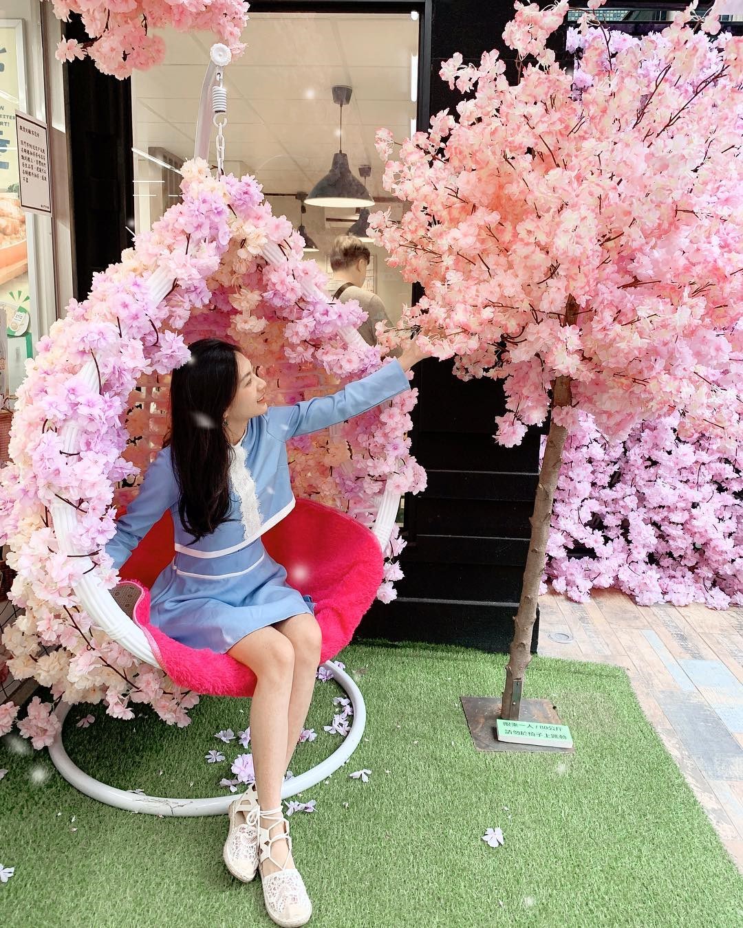 位在台北東區的誠安門市,將門面打造成整面櫻花花海,櫻花花瓣排列出夢幻粉色櫻花廊道,搭配草地地毯,就像在櫻花樹下野餐,超夢幻,一旁還設計了櫻花友情搖椅,沉浸在滿滿櫻花海浪漫氛圍裡。