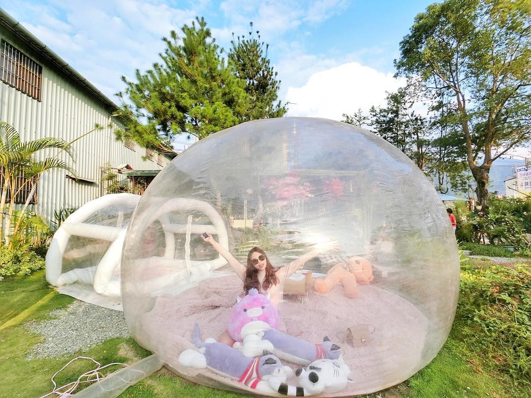4公尺寬的透明泡泡屋,打造成溫馨小天地,還可以進入拍照,享受日光浴帶來的悠閒氛圍,一旁直徑約有6公尺的巨型氣球,白天看像是一顆太空星球,夜晚點燈下,搖身一變成為地球的好鄰居-月球,超美景緻看得出店主的用心設計。