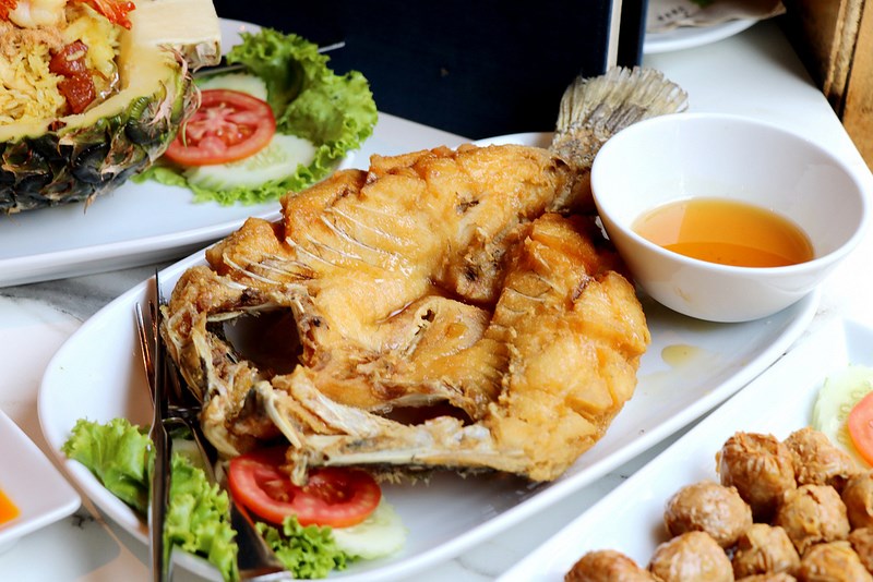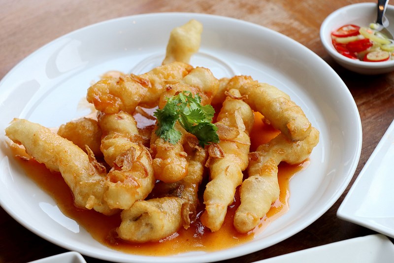 將軟嫩新鮮的鯛魚裹粉酥炸之後淋上酸甜羅望子醬