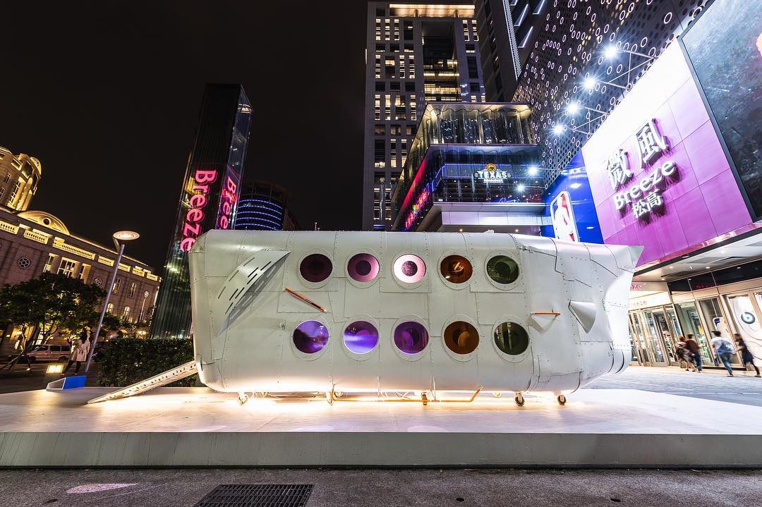 ▲▼藝術家在信義商圈打造一座穿梭時光的旅行艙,民眾可一邊聆聽環境音樂,一邊觀看影像變化