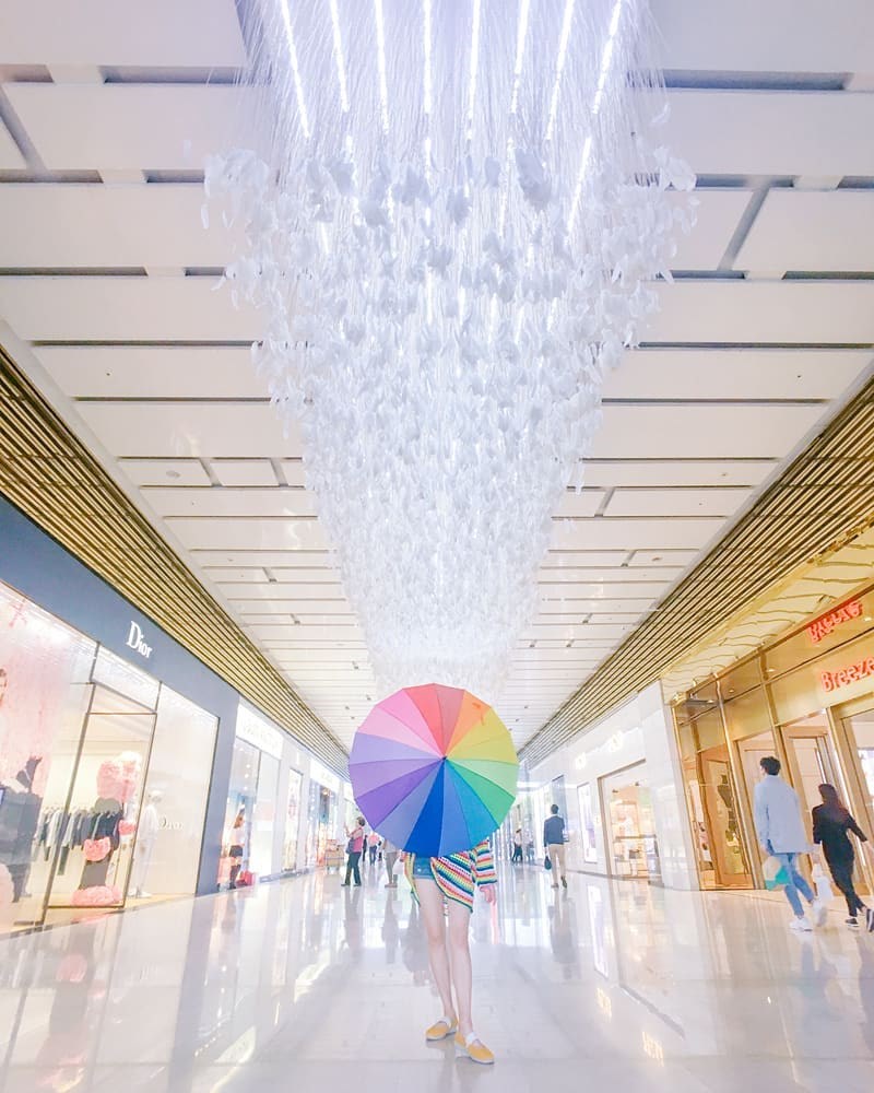▲藝術家在微風信義走道中,以竹與羽毛等材質,編織一片閃耀著銀亮光芒的羽白天空