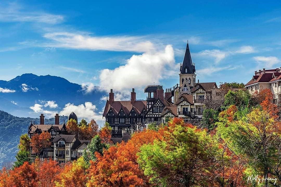老英格蘭莊園座落在清境群山環抱的無憂之地,保留了英國晚期歌德式建築的塔樓,垂直式的建築,由中間突起向兩旁對稱,隨著秋冬季節的來臨,圍繞在建築旁的落羽松由綠轉紅,搭配清境的蒼翠山群,唯美的畫面是台灣最美的風景。