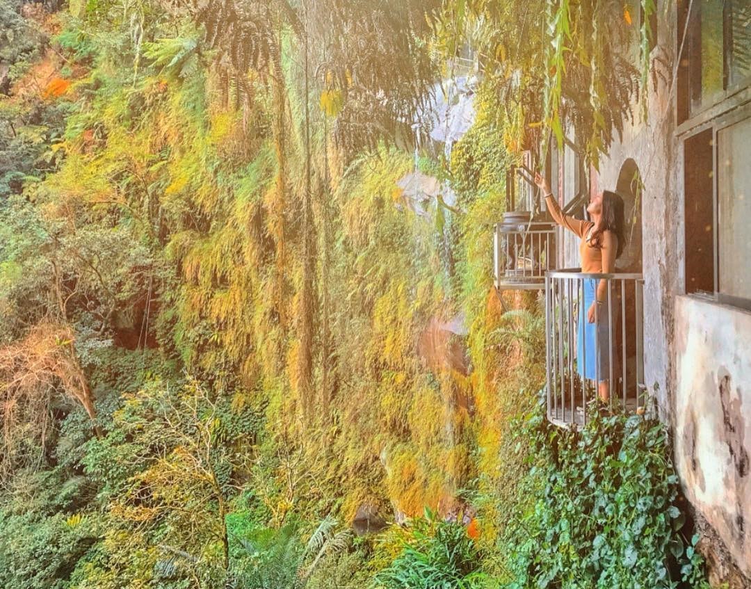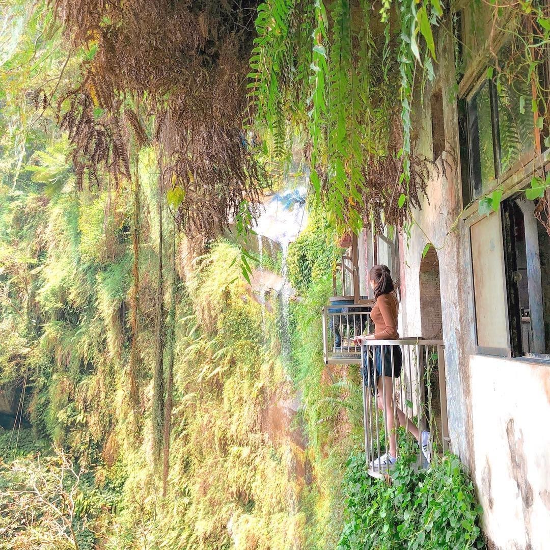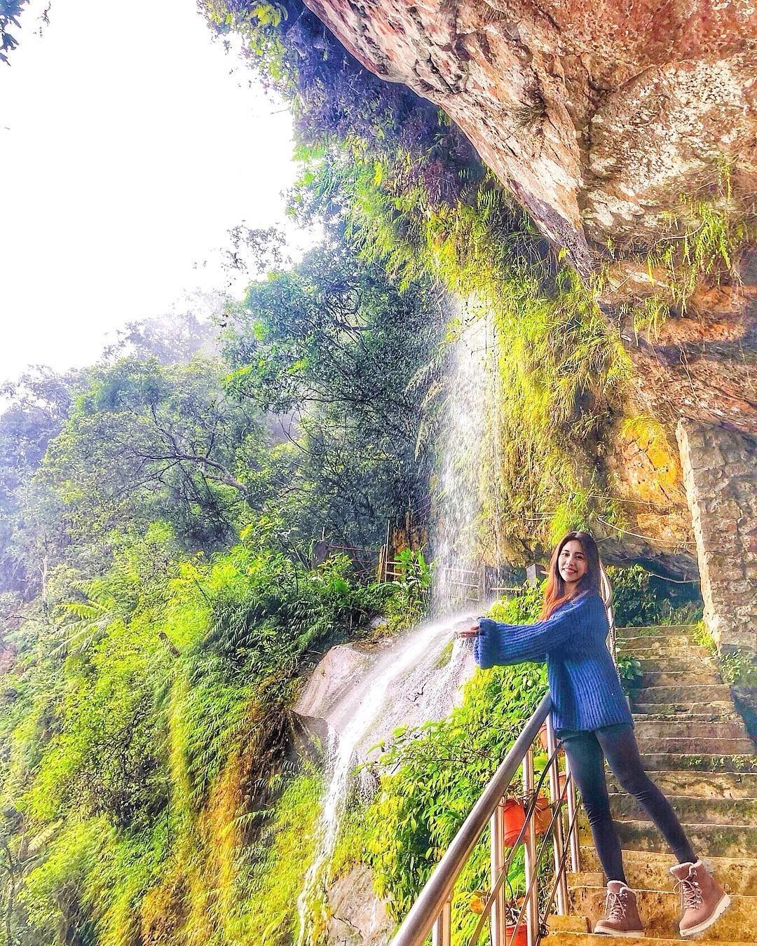 ▲站在古意盎然的小廟窗台上,瀑布產生的水霧,置身在其中彷彿在仙境