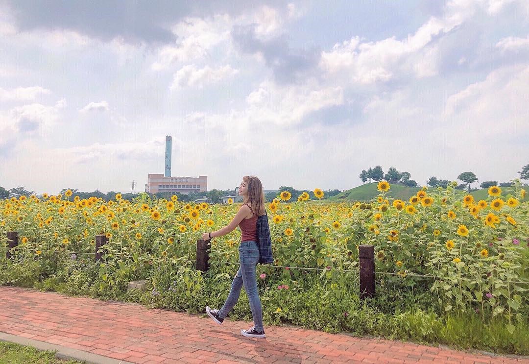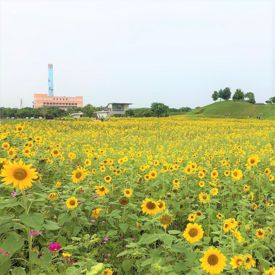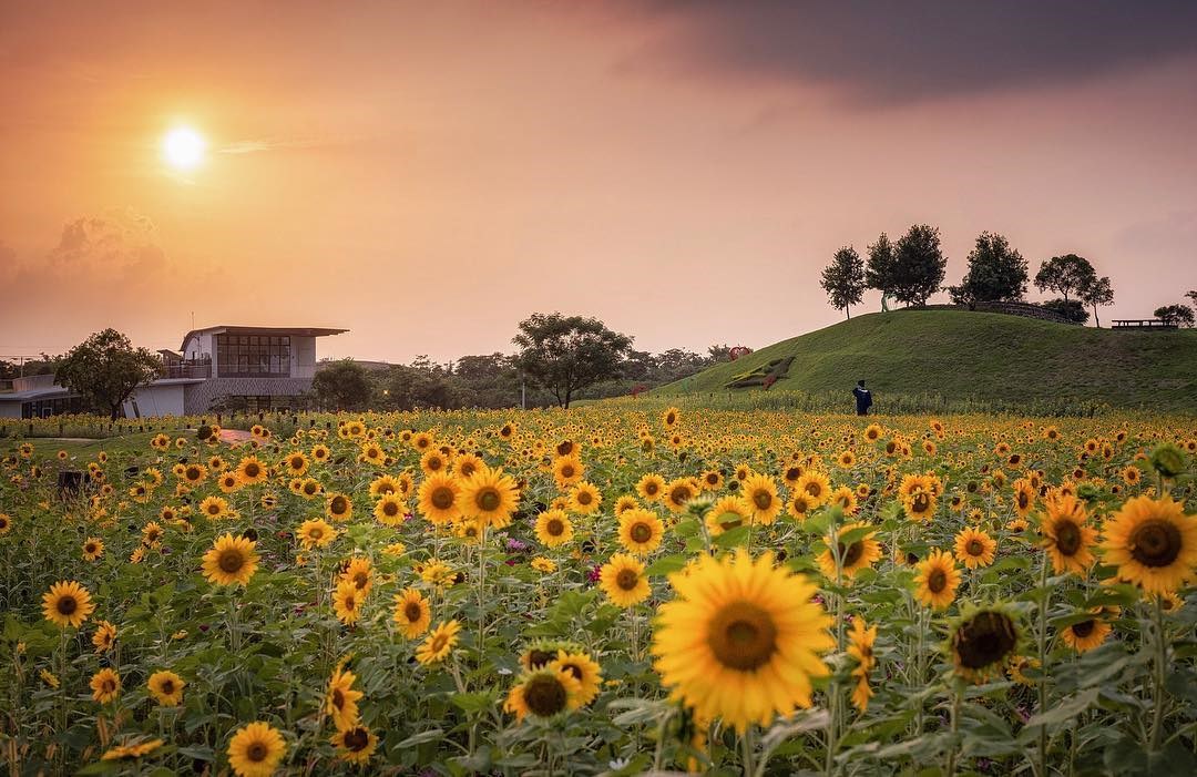 后里環保公園的向日葵面積約1.2公頃,一大片黃金色的向日葵及周圍的山丘地形成強烈的對比,讓花海更有環狀步道提供民眾可以在各個角度貼近花海合照及欣賞,一旁還有小山丘能俯視花海盛開的美景。