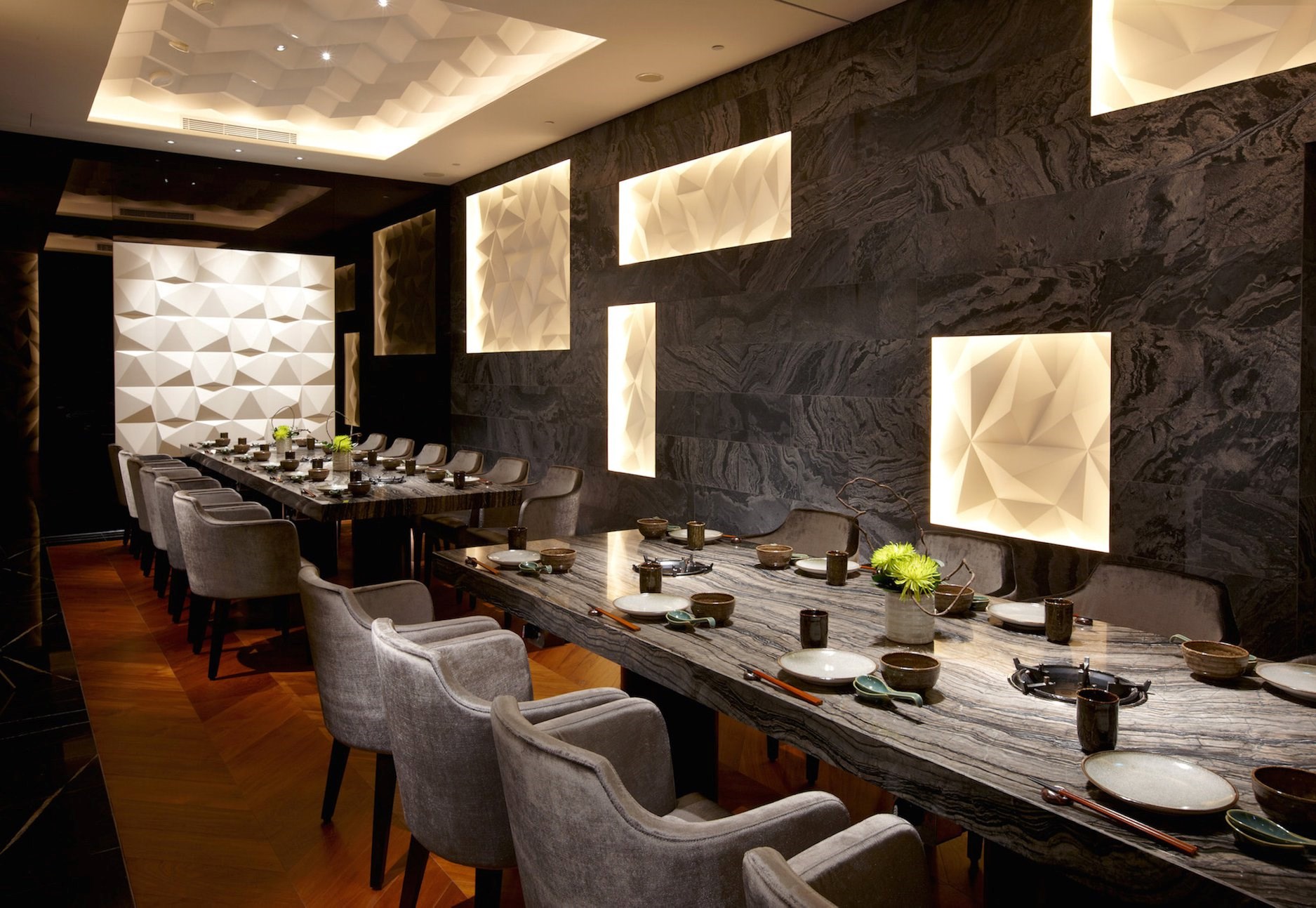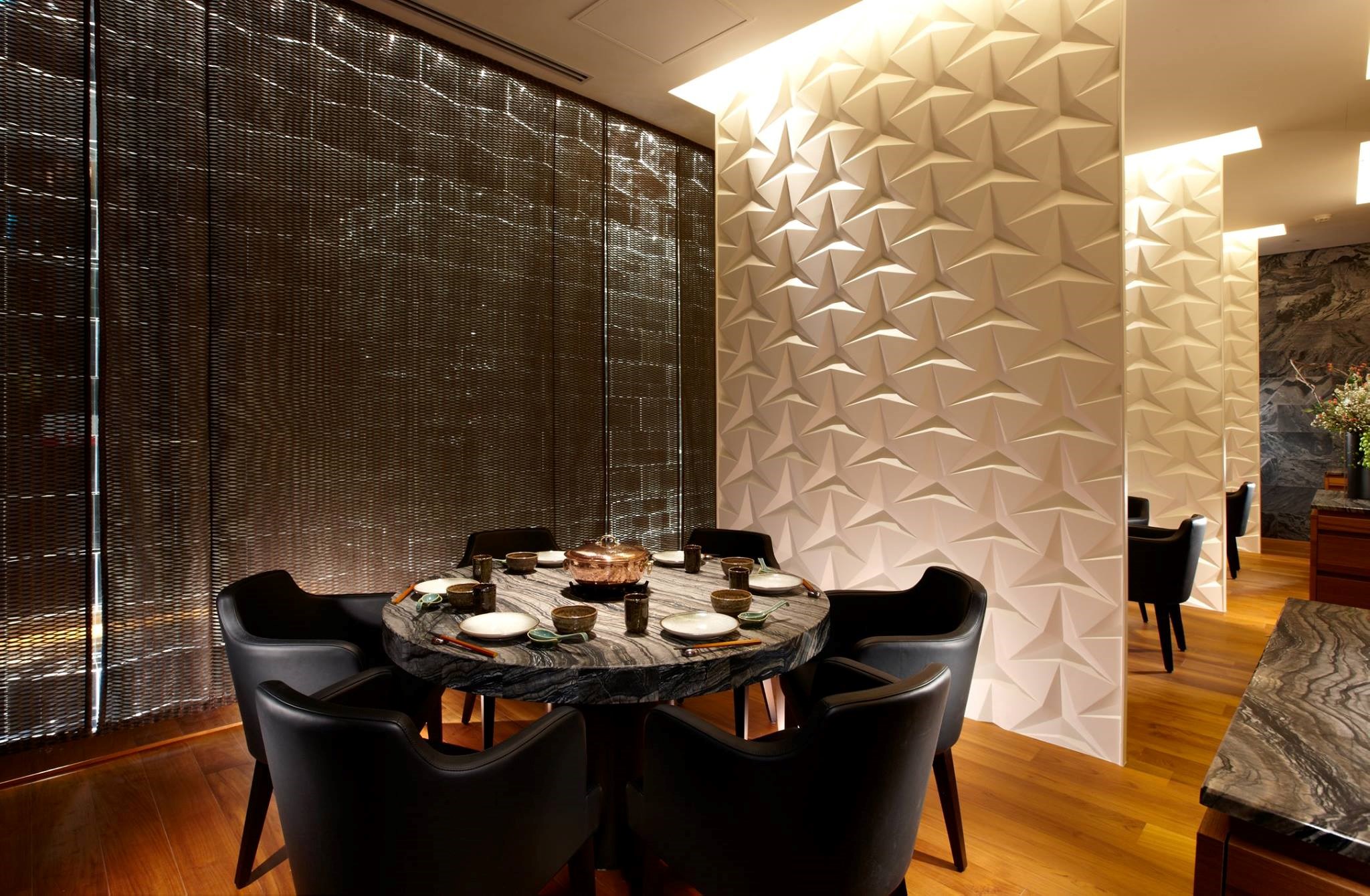 ▼同樣運用日本摺紙藝術為概念,打造出的白色隔間牆,搭配大理石桌,舒適的用餐空間氣派不已