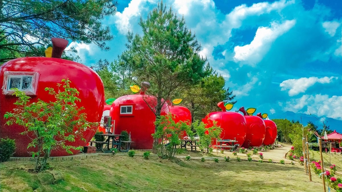 ▲巨大顯眼的蘋果屋坐落在農場中,鮮紅色的大蘋果與翠綠山林相映成趣