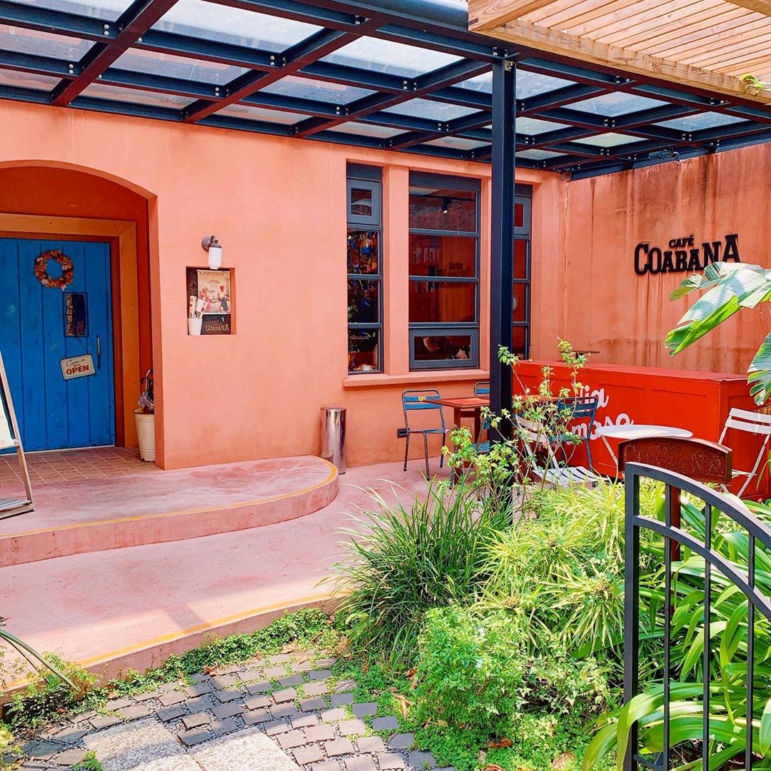 ▲亮眼的橘紅色的外牆上掛著 COABANA 英文字樣,搭上斑駁的金屬桌椅,超有特色超好拍