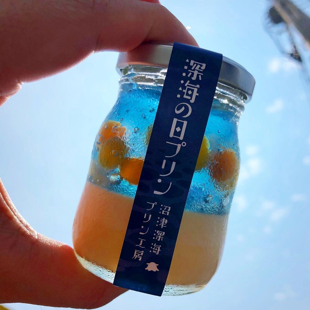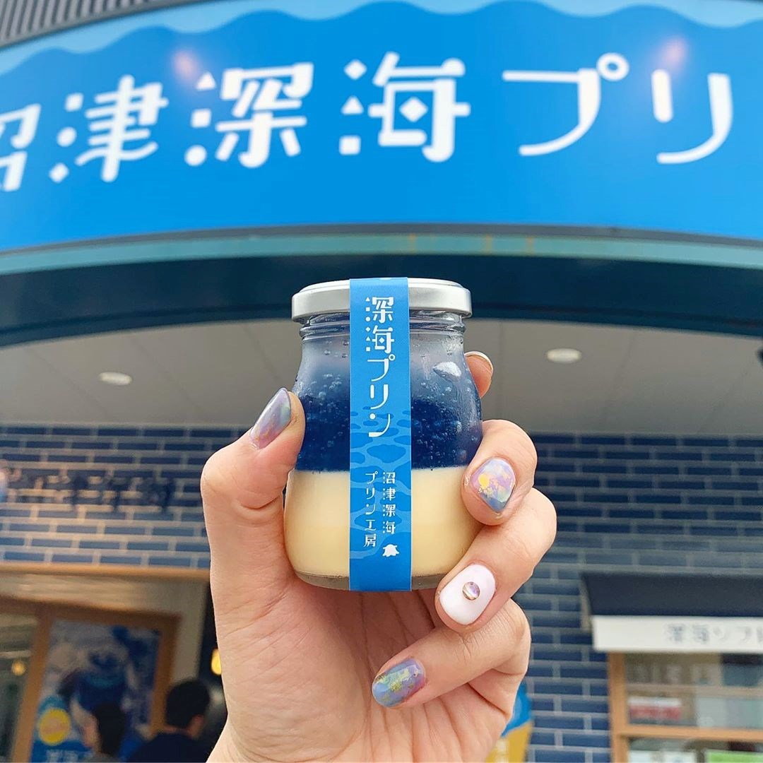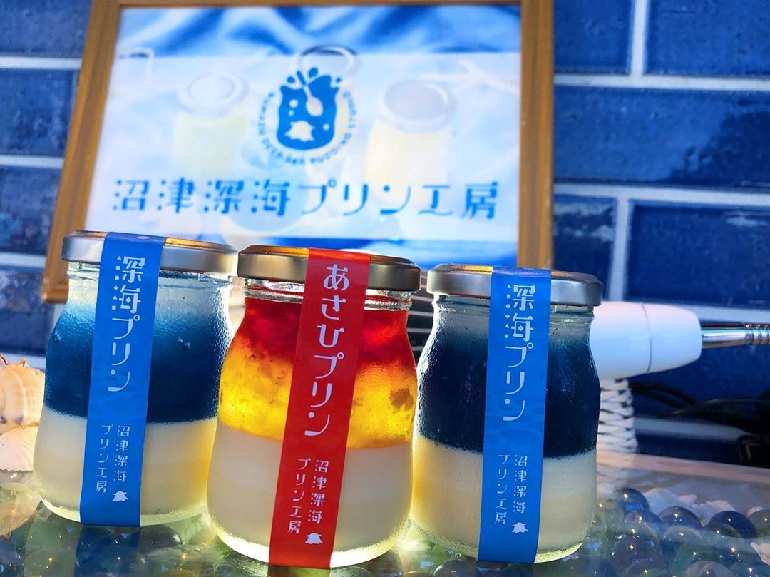 「沼津深海プリン工房」以透清涼的深海布丁為主打販售一系列布丁食品,招牌「深海布丁」是以彈珠汽水製作來呈現海水透藍的視覺效果,配上粉嫩的布丁,買到時讓人少女心大噴發,一定要讓相機先吃才行,神秘的深藍布丁,也成為了沼津最新的人氣地標。