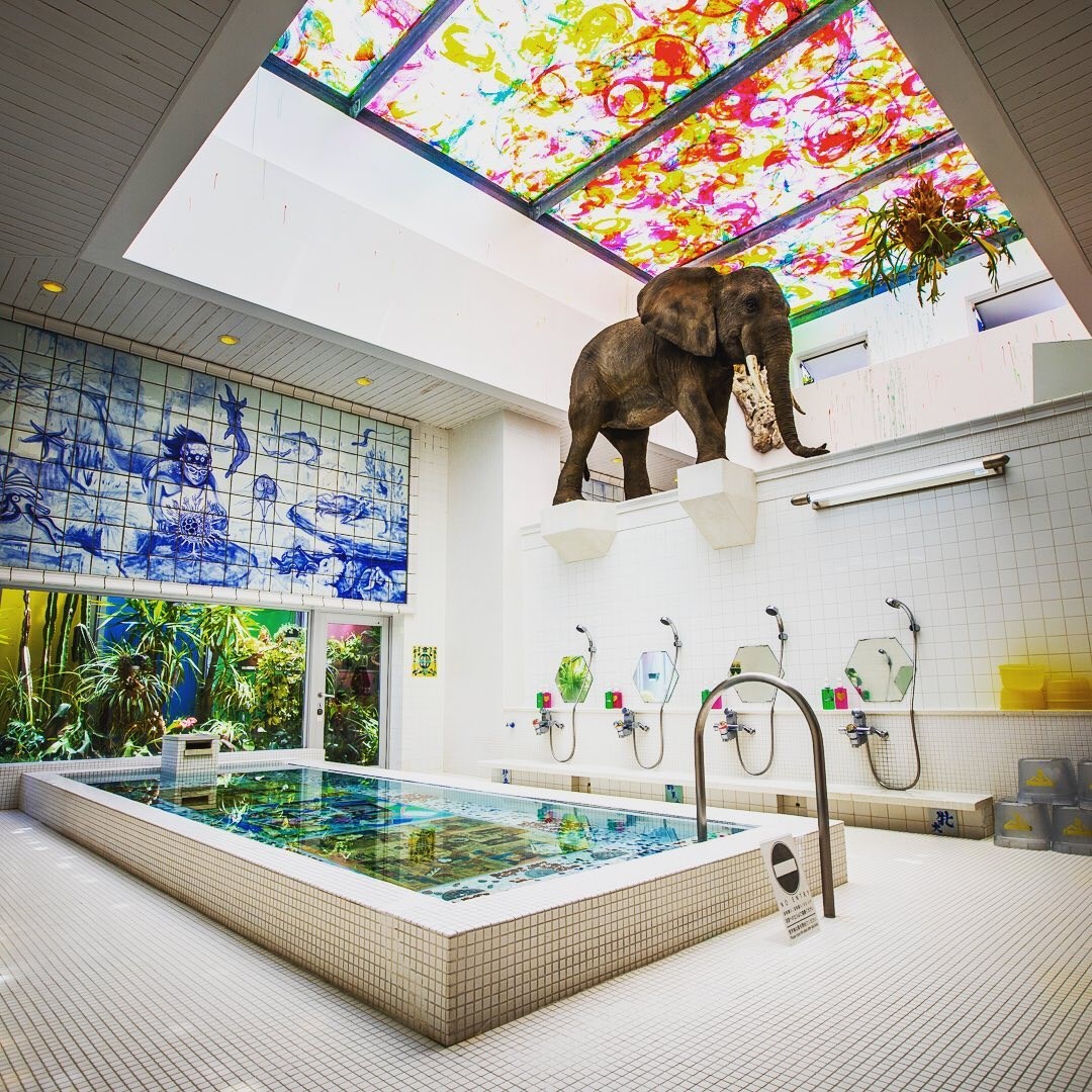 澡堂吸睛的不只店外的裝置藝術風格,澡堂里的男女湯隔牆上有一隻超大的大象,相當壯觀,澡間的牆壁、天花板,甚至澡池底下也鋪滿了春畫以及普普風的圖像作品,就連水龍頭開關每一個都不同,簡直就是在美術館中洗澡阿!
