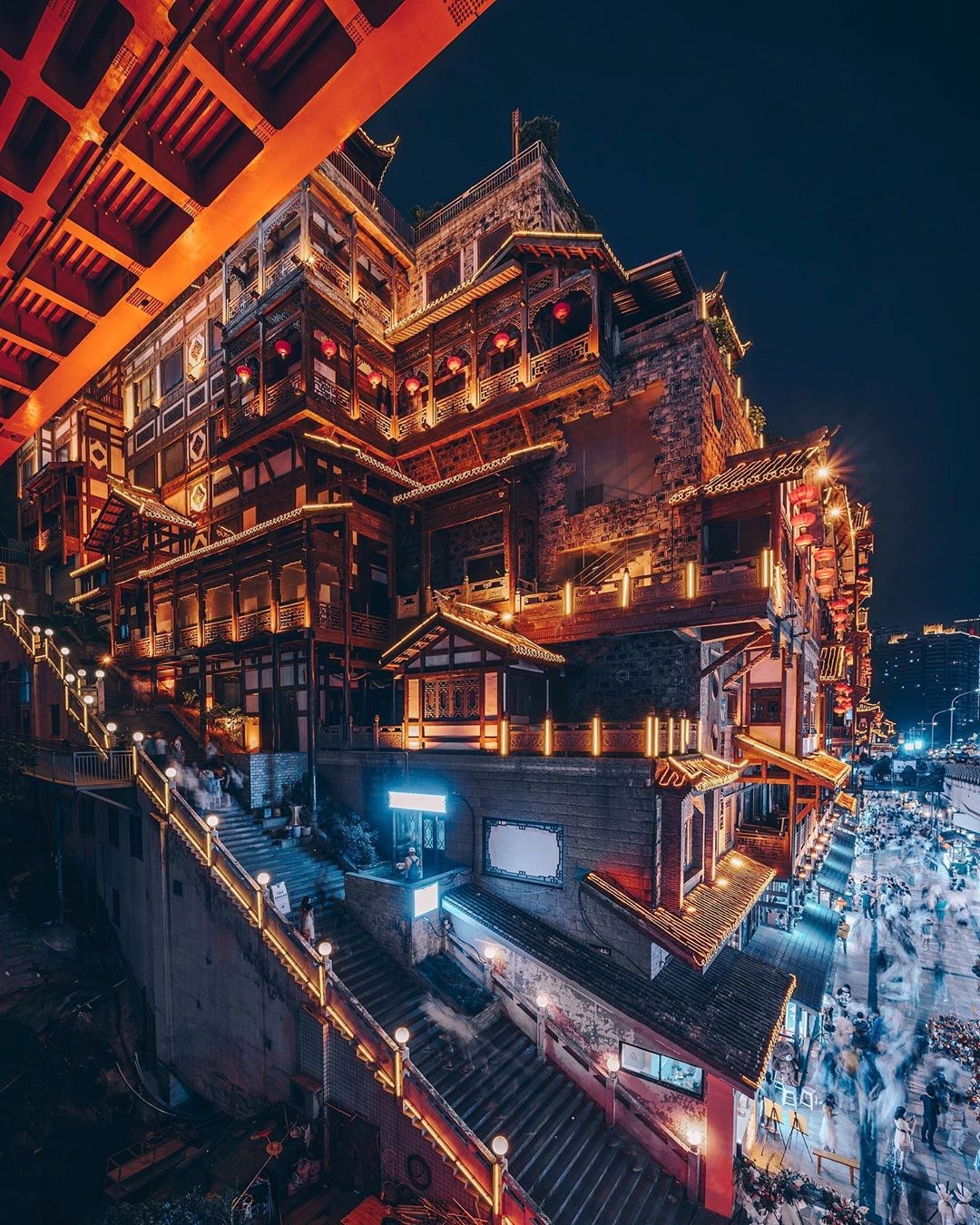 位於長江、嘉陵江兩江交匯的濱江地帶的洪崖洞,整個商圈面積頗大,高度將近11層樓高,洪崖洞商圈中除了當地各式各樣的小吃外,還能遠眺重慶風景,不管是百家燈火闌珊或是兩江的璀璨風光,都能一覽無遺,相當迷人。