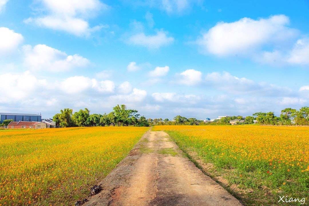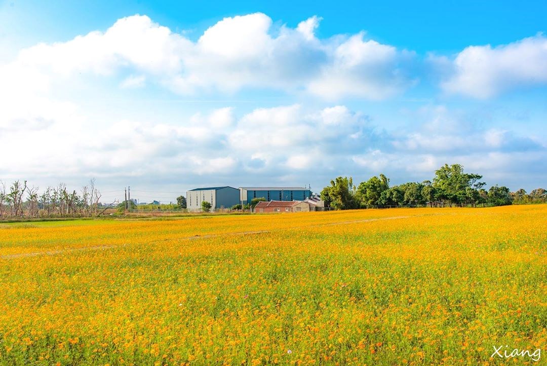 桃園新屋區因周董曾在此拍攝「稻香MV」 近而引發一波朝聖打卡熱潮,不過MV中的稻田最近悄悄的披上橘黃色的新衣,變成一片波斯菊花海,放眼望去多達1公頃,伴隨著徐徐微風吹來,花朵搖曳畫面相當美麗,也吸引不少人前往拍照。
