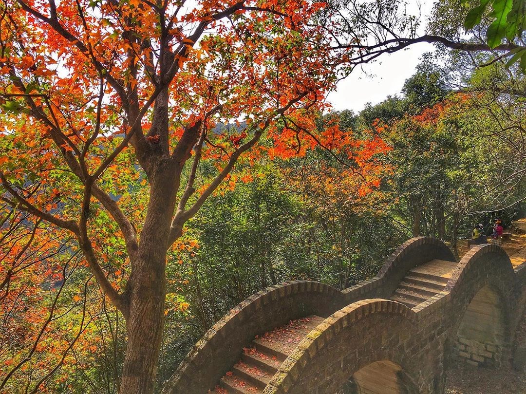 每年12月中旬左右,在新北汐止三秀山的拱北殿就進入賞楓時節,「槭樹」楓紅隨著天氣逐漸轉紅,從入口處停車場開始,就能瞧見兩側的楓林大道,加上古樸素雅、東方味十足的廟殿,增添賞楓氛圍,而園區裡的紅色彼岸橋、雙拱古橋更是超人氣賞楓景點,讓人驚嘆不已。