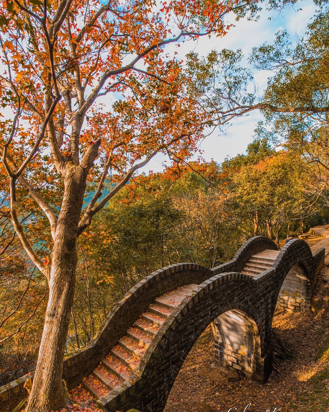 說到北部有名的賞楓景點,位在新北汐止的拱北殿絕對是必看景點之一,沿著清幽的山寺拾級而上,步行約15分鐘就能到達,日式石牌與石橋,帶著濃濃的日式氛圍,加上楓紅的點綴,典雅風格讓人超驚豔。