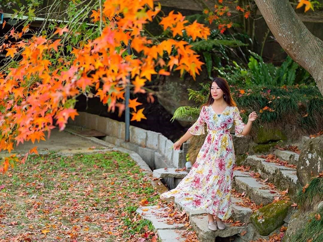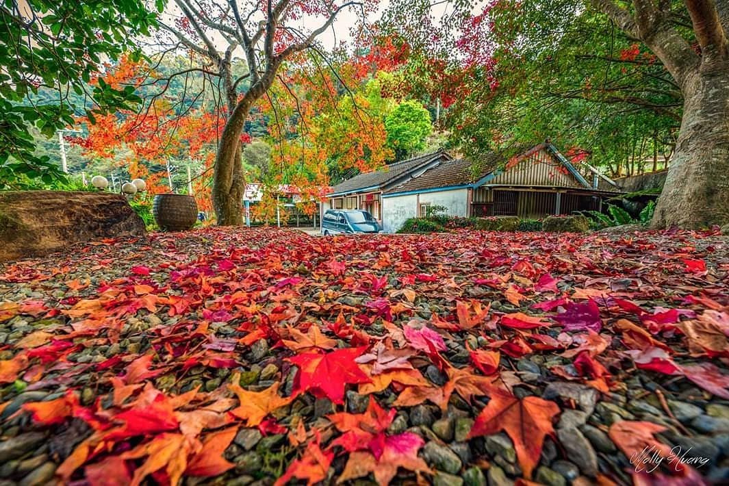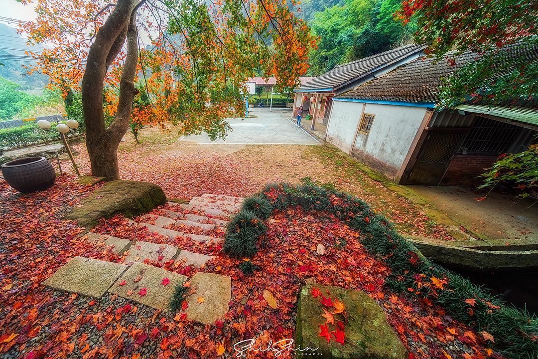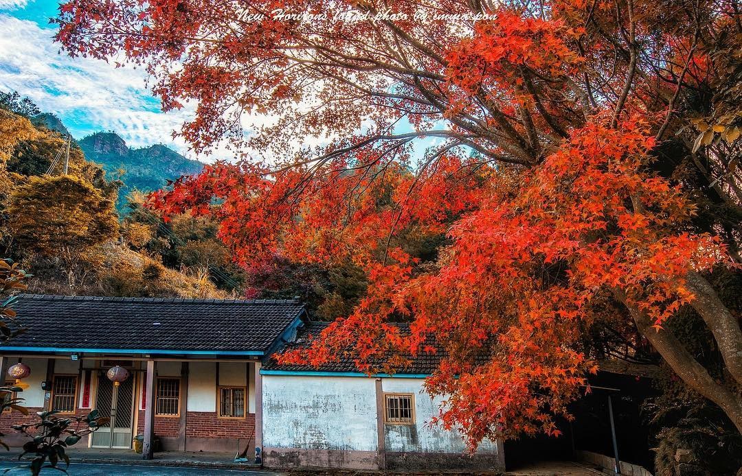 這處近幾年成為許多攝影玩家們的賞楓秘境,空間不大卻處處都是經典畫面,幾棵巨大的老楓樹,綠葉由黃轉紅,與老屋、土地公廟交織成帶著獨特台灣風的楓葉畫面,古色古香的氛圍讓人特別驚豔。
