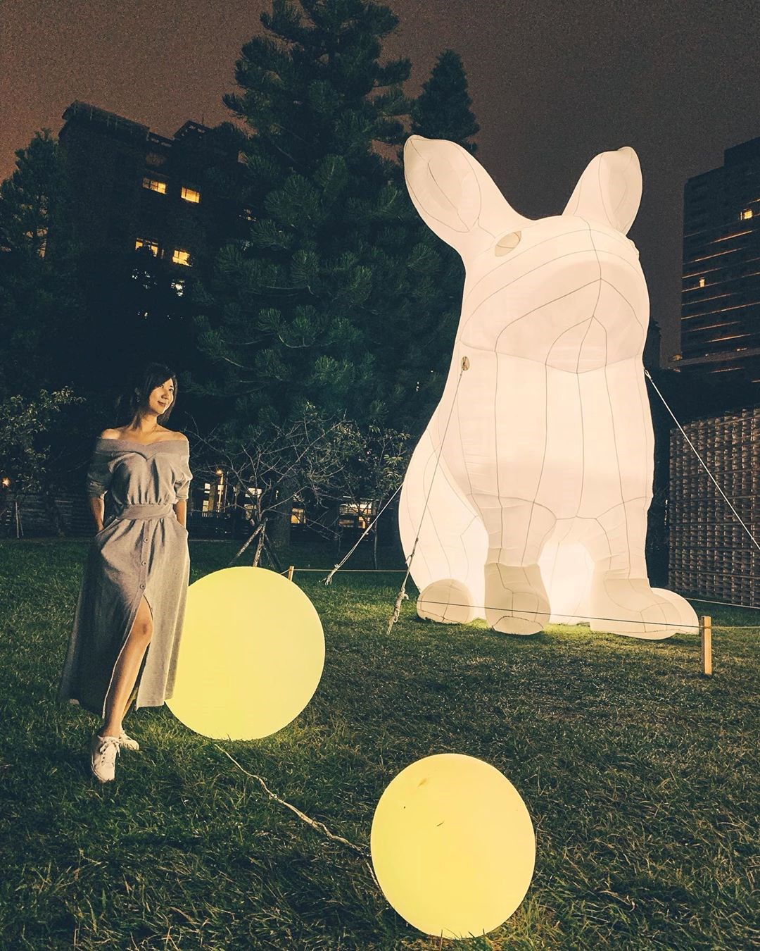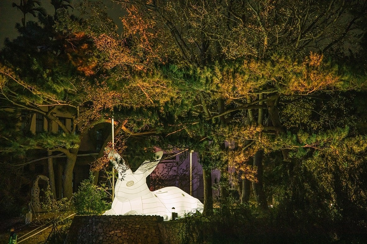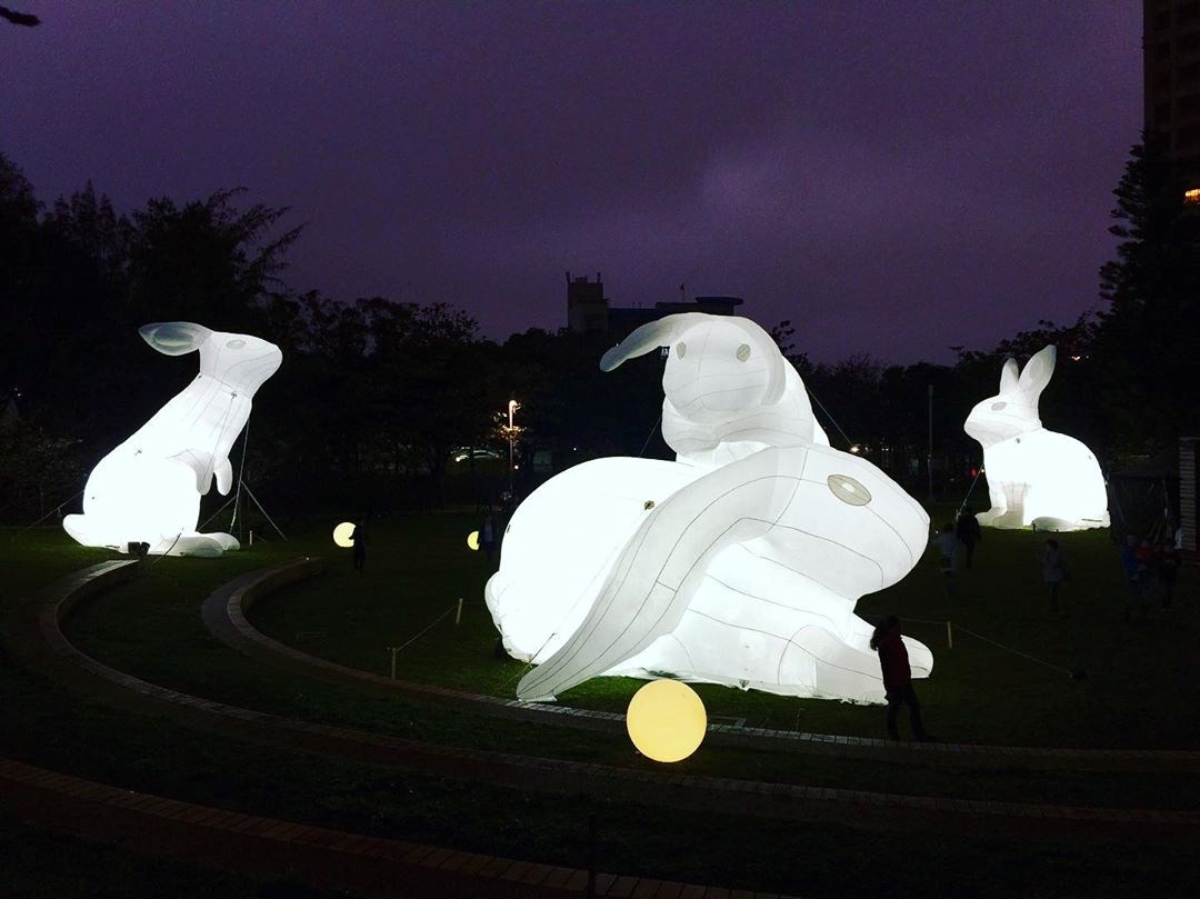 為了歡慶即將在12月28日全新開園新竹市立動物園,新竹市政府在新竹公園打造超萌5隻大白兔,每隻不僅都有7公尺高,各種可愛的姿態現身在樹叢中,在夜晚點上白色燈飾,顯得更加可愛吸睛,不僅如此,整座園區裡還有炫麗的燈球、燈光點綴,水岸旁的樹木在夜晚照耀著藍紫色燈光,景緻超夢幻!
