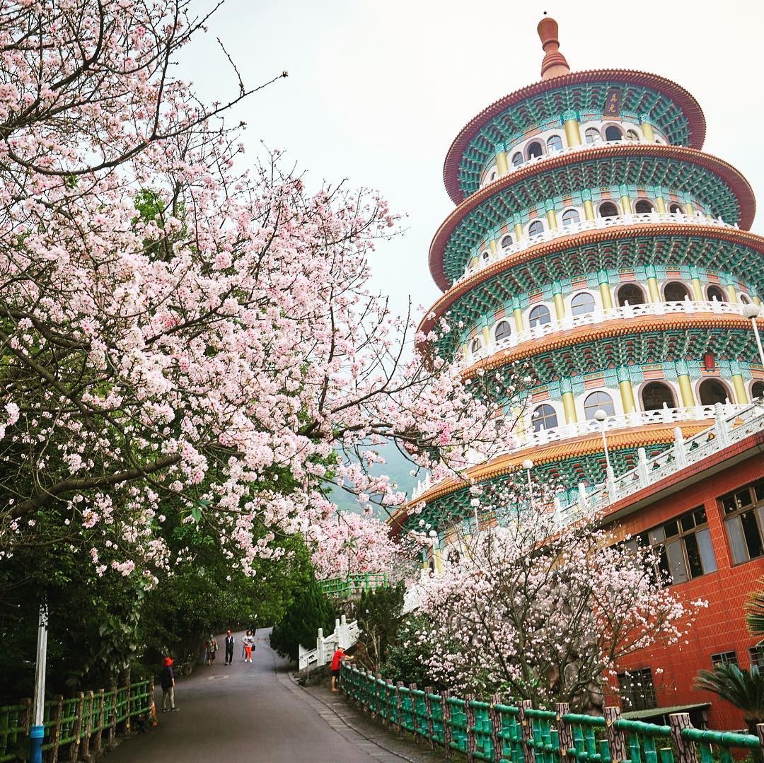 淡水天元宮是ㄧ座五層樓,高約200尺的圓形建築,繽紛且精緻的外觀相當具有特色,每年2、3月櫻花季時,園內開滿粉紅色的花朵和繽紛的天元宮,形成一幅美麗的畫面,不少人特地前來朝聖一睹迷人風采,今年因氣候緣故有機會提早賞櫻。