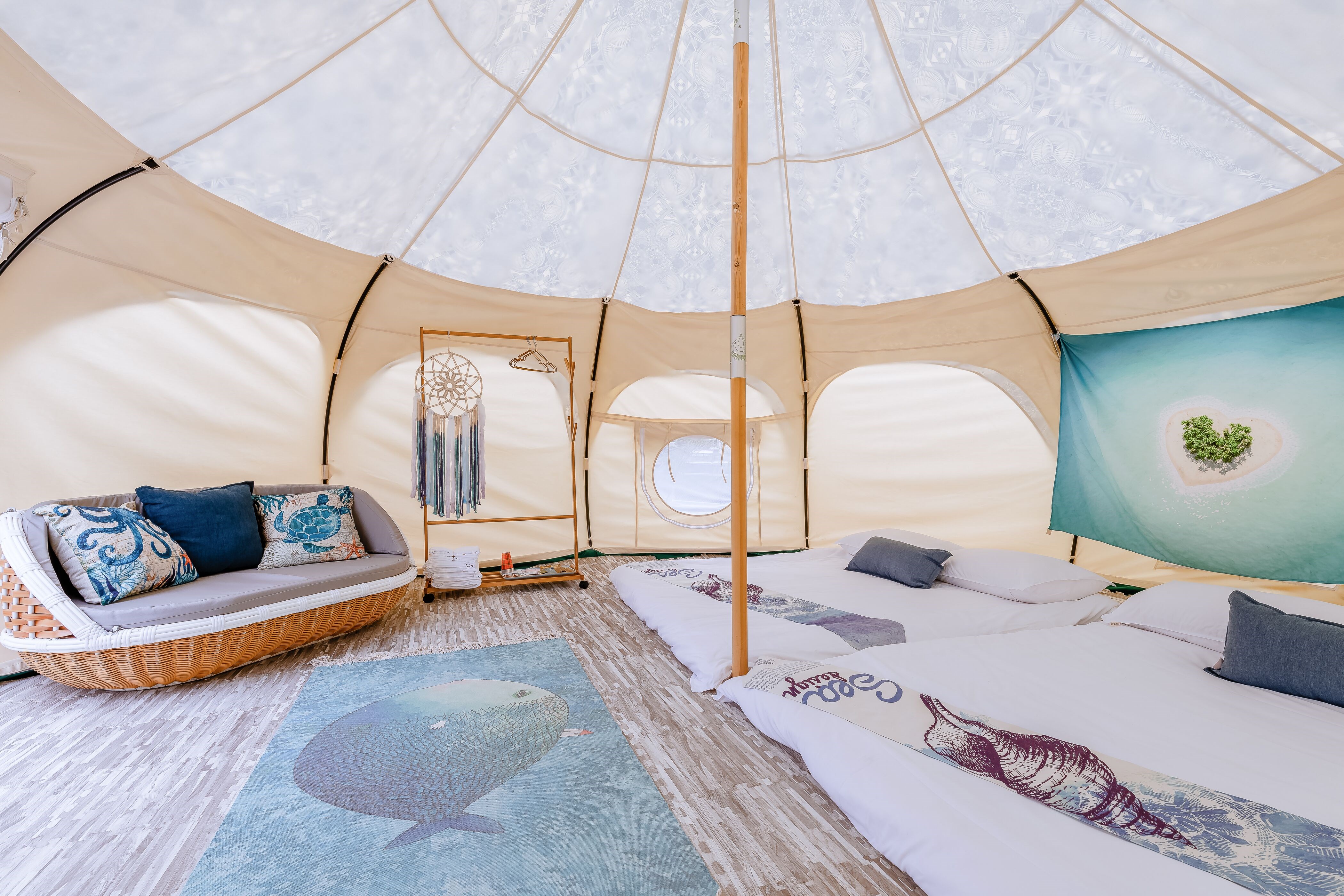 ▼每頂帳篷內設計都有些微不同,「波拉島」添加了藍色元素,加上木質藤椅,有種清新海島度假FU