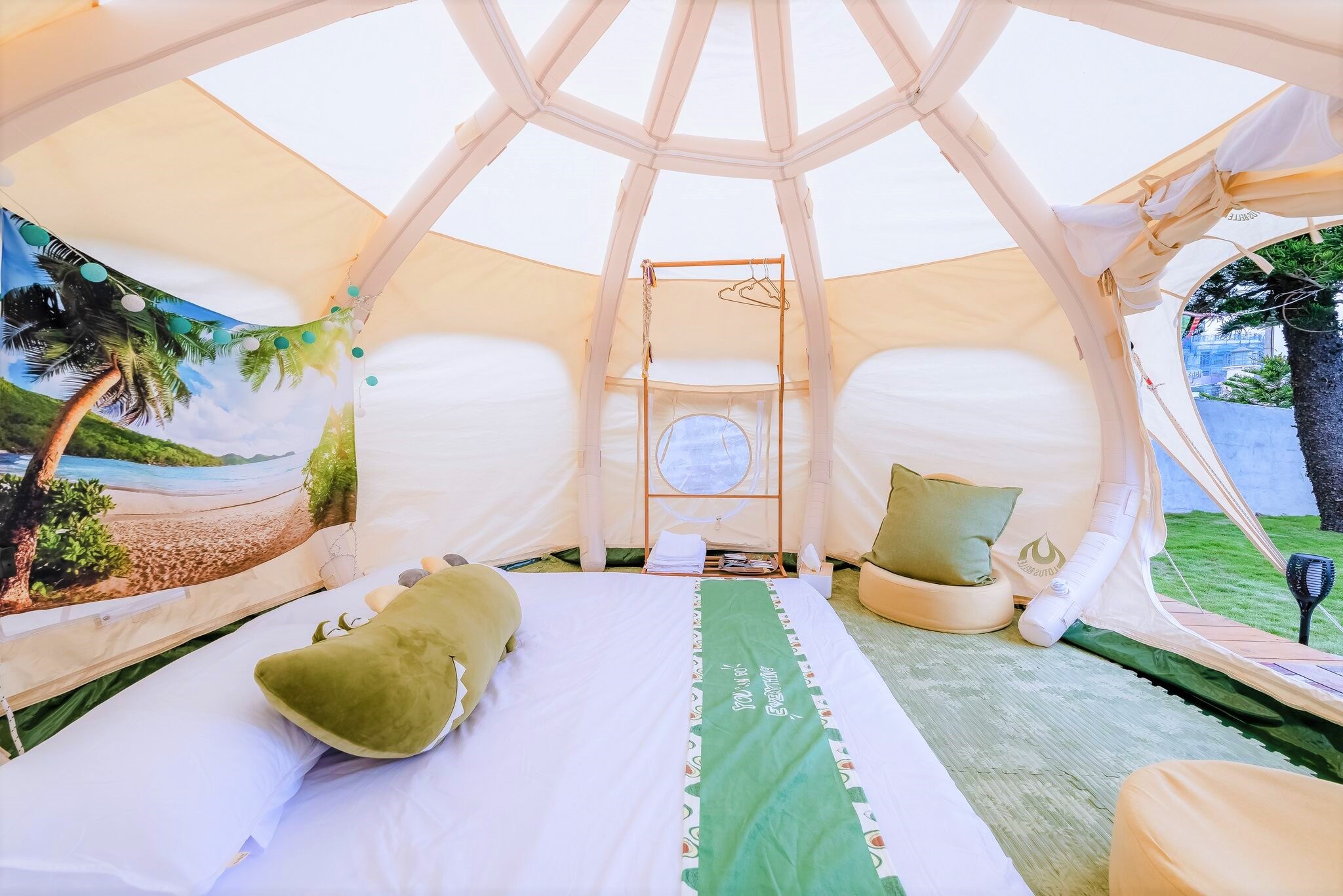 ▼寬敞的帳篷內,以米白色與綠色做為主色調,加上木色系家具,溫馨又柔軟的氛圍感覺特別放鬆