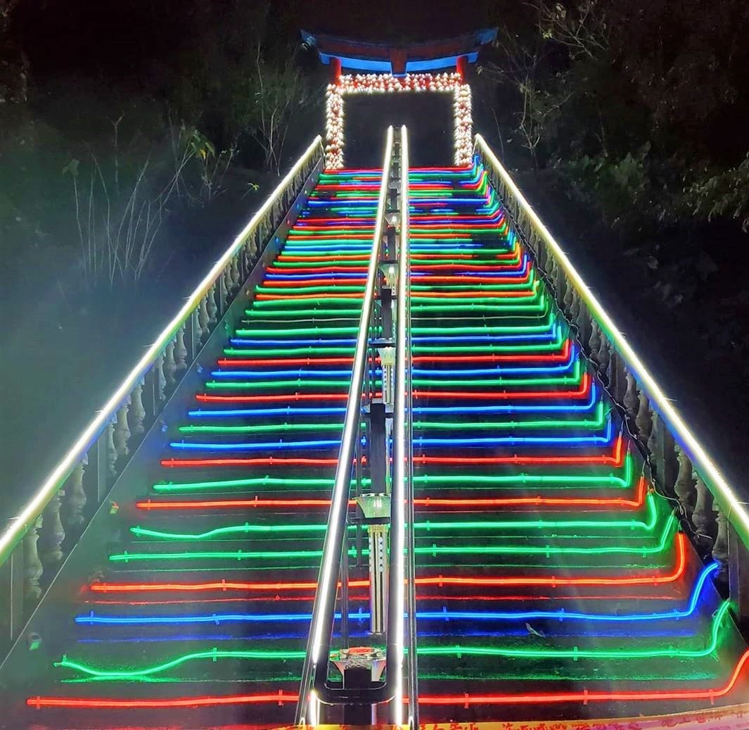 ▼不同於白天有著日式氛圍的員山忠烈祠,夜晚化作彩虹「音樂階梯」