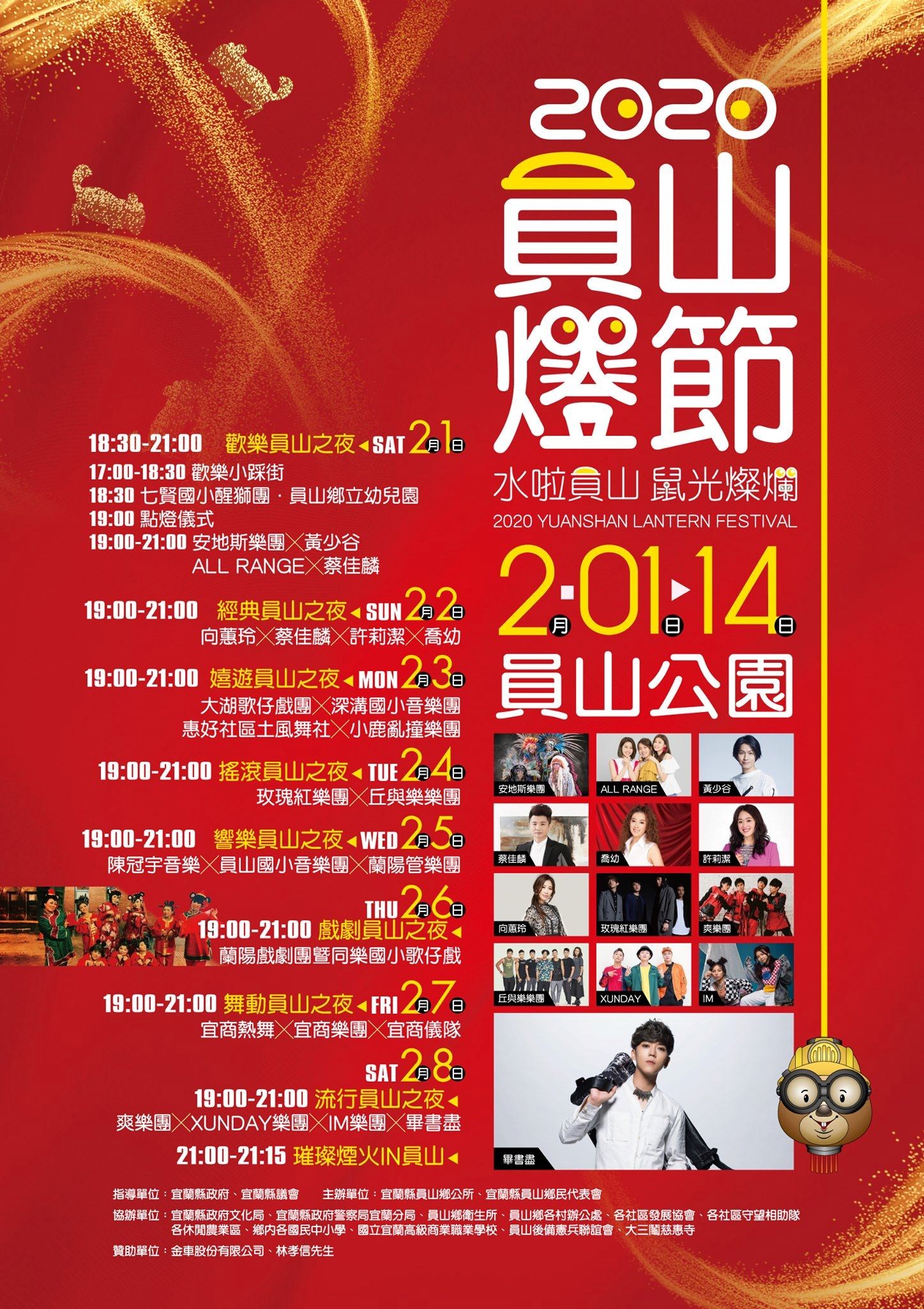 除了精彩燈飾外,各類活動也是精采可期,從2月1日開幕起至2月8日,每晚都有不同歌手與樂團獻唱,最大咖畢書盡則將在2月8日晚上與睽違多年的煙火秀同天登場,施放長達10-15分鐘的璀璨煙火,一起熱鬧慶元宵!