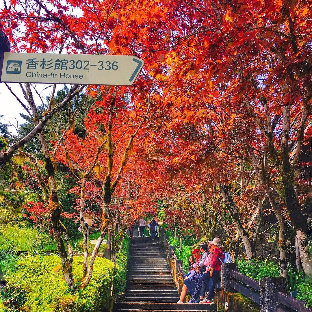 火紅一片的「紫葉槭」在周圍綠意盎然的山林襯托下顯得更加夢幻,漫步楓紅下,伴隨著微風輕輕吹拂,空氣中帶著一股森林芬多精的氣息,令人心曠神怡,園區中還設有不少景觀台與咖啡館,快做好筆記收進口袋名單,之後來到宜蘭可別忘了到太平山走走喔!