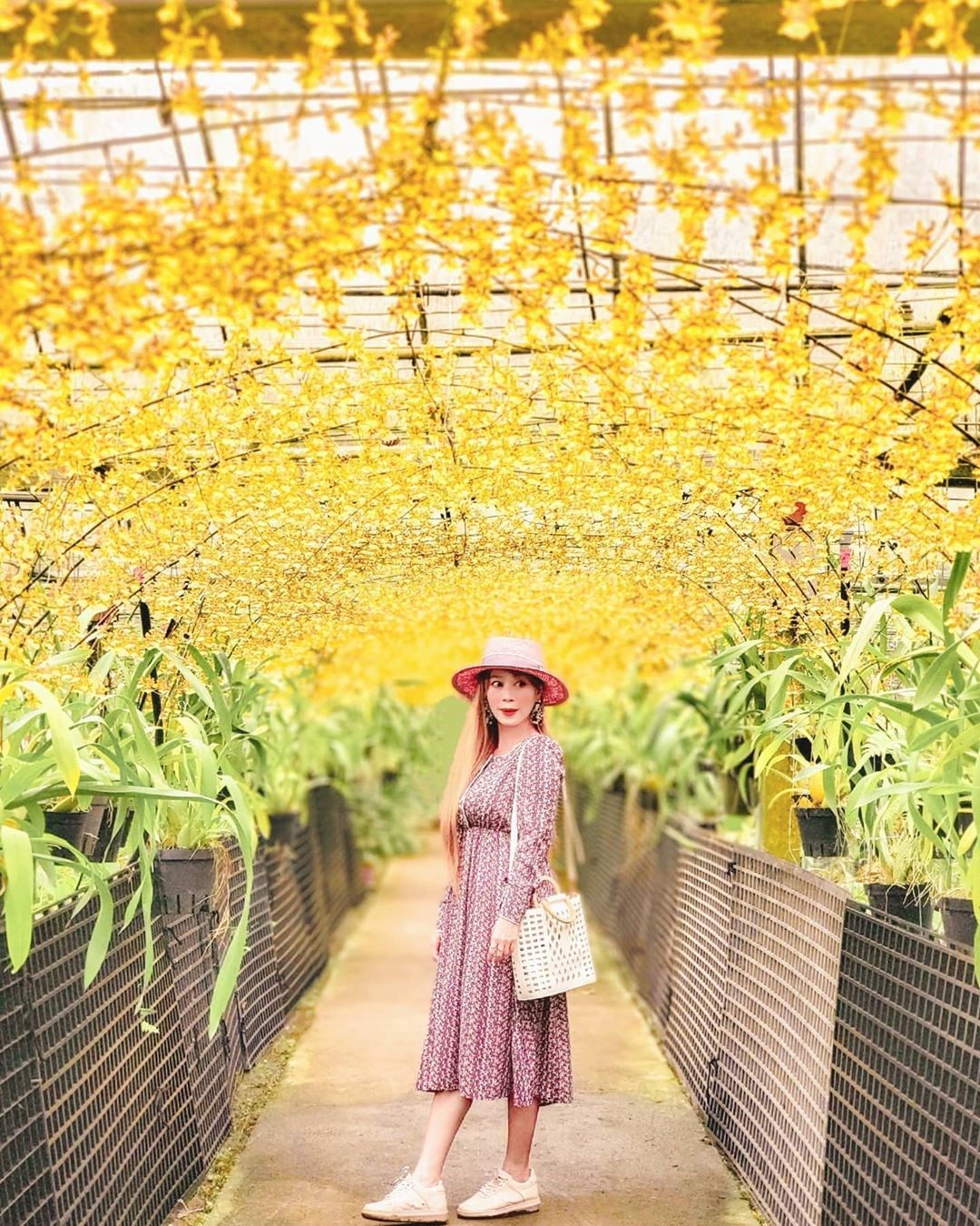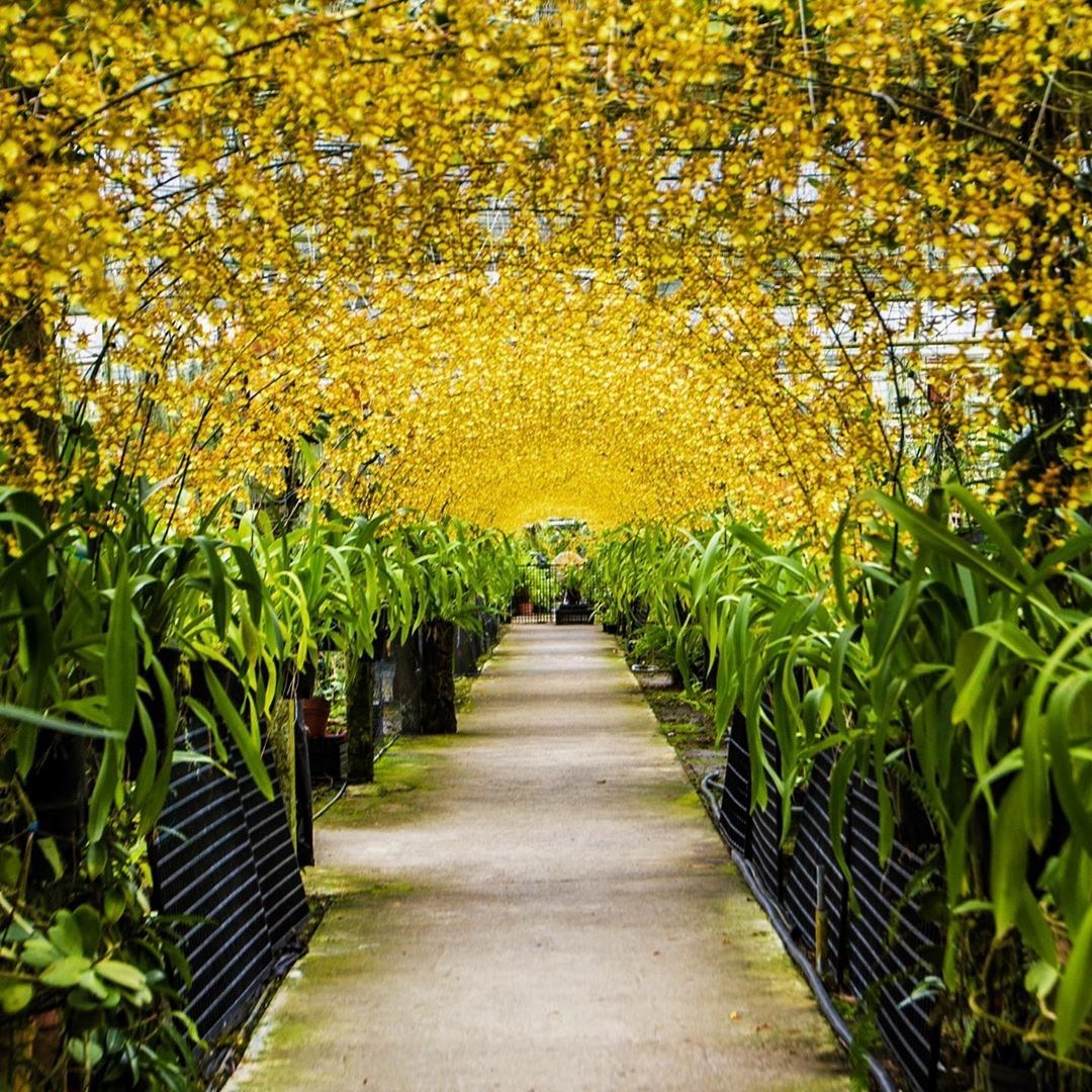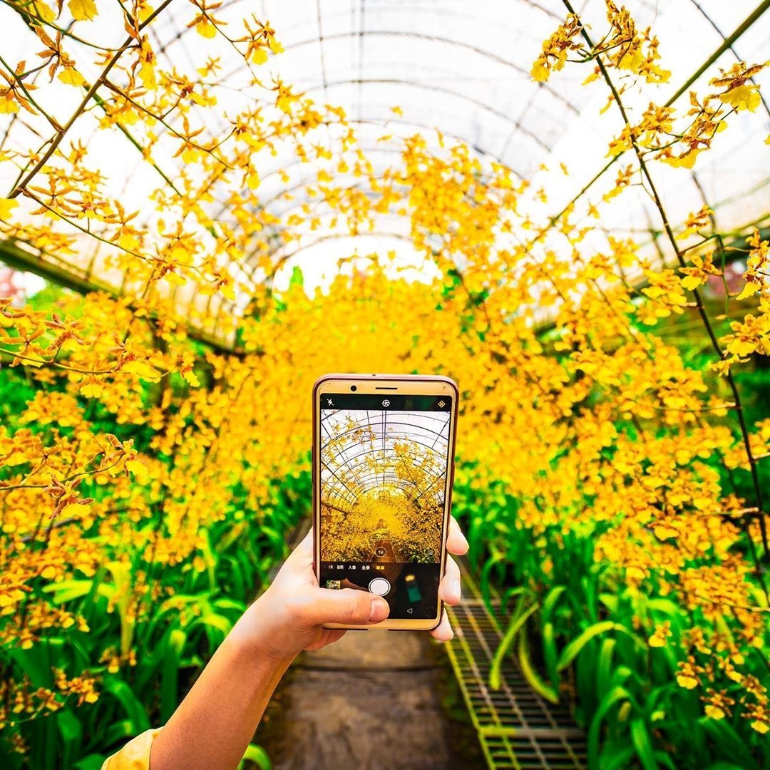 這座「文心蘭黃金隧道」其實平常不開放,每年五月開始陸續盛開,500盆的金黃色的文心蘭遍佈整座花棚,形成綿延百尺的金黃色隧道,隨手一拍都超有意境,意外成為隱藏版的IG打卡點,吸引不少粉絲特地朝聖大拍美照。