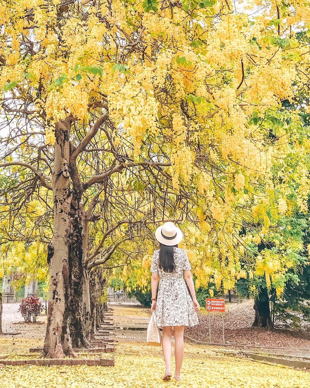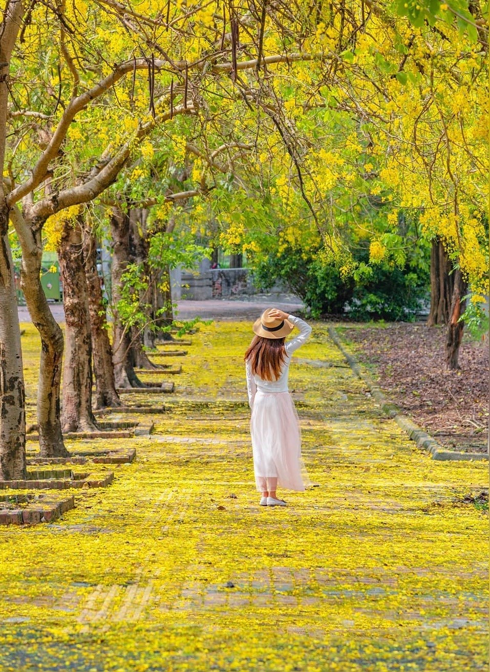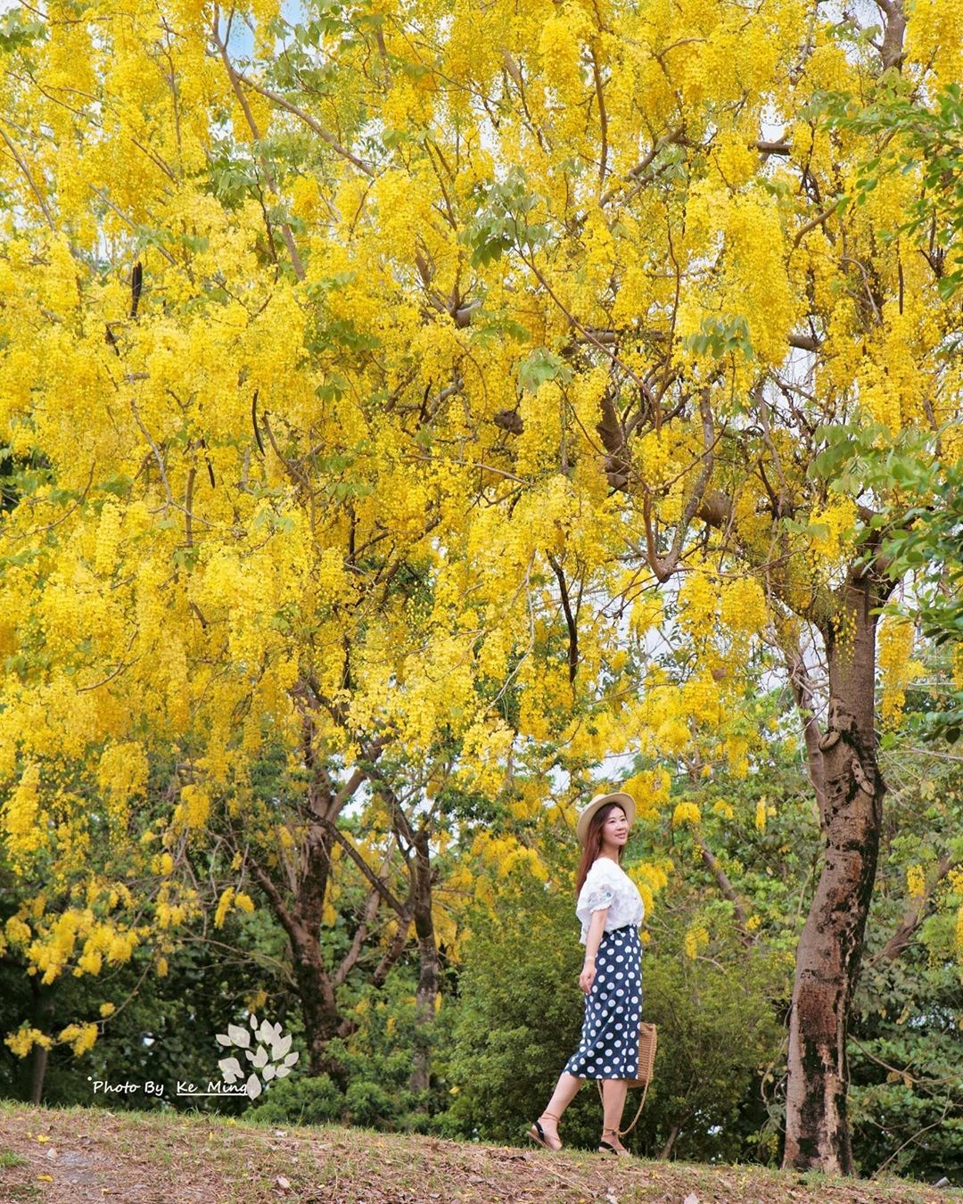 「麟洛運動公園」佔地20多公頃,有各式各樣的遊樂設施,設有觀景台和人工湖泊,自然生態相當豐富,全區開放免費參觀,也是不少屏東人假日踏青的口待景點,園區種植不少阿勃勒,前一陣子陸續開起黃色如風玲般的花朵,形成美麗的金黃色隧道遠遠看就相當吸睛,隨手一拍都超有意境。