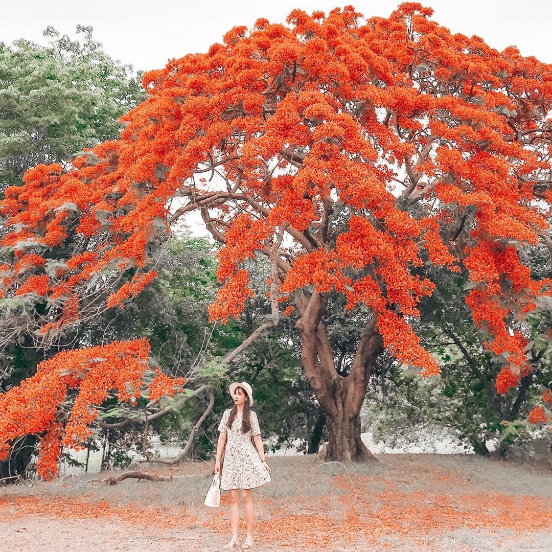 每年5、6月開始進入鳳凰花開的季節,近期因氣候炎熱,位在屏東潮州大橋旁有一株鳳凰木提前爆炸盛開,遠遠看就超級吸睛,有不少過路人都特地停下來大拍美照,相信再過不久,就會成為IG上的打卡熱點。