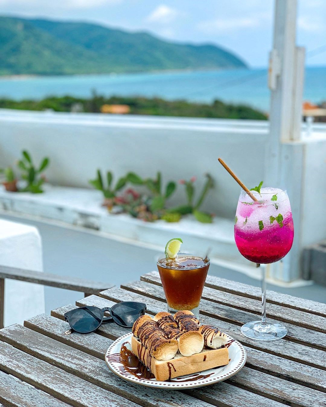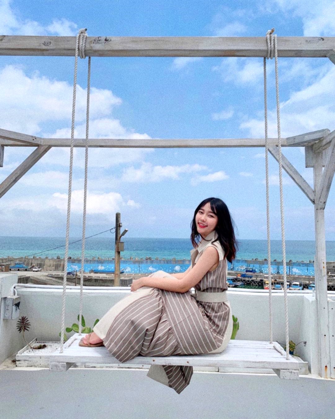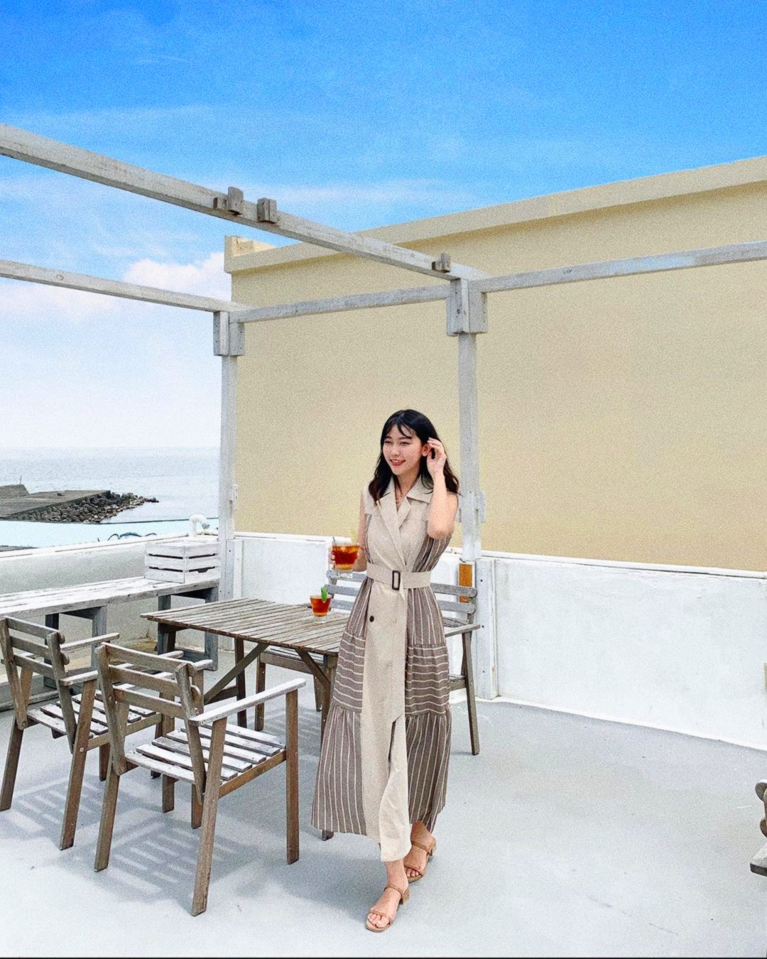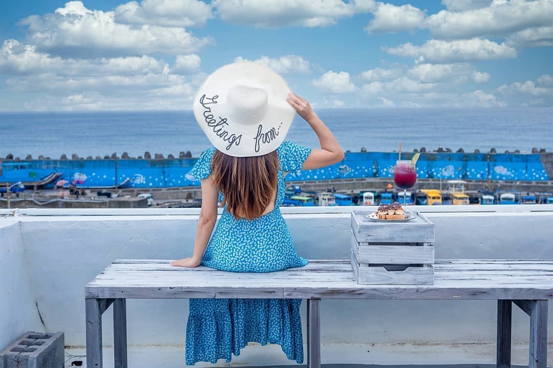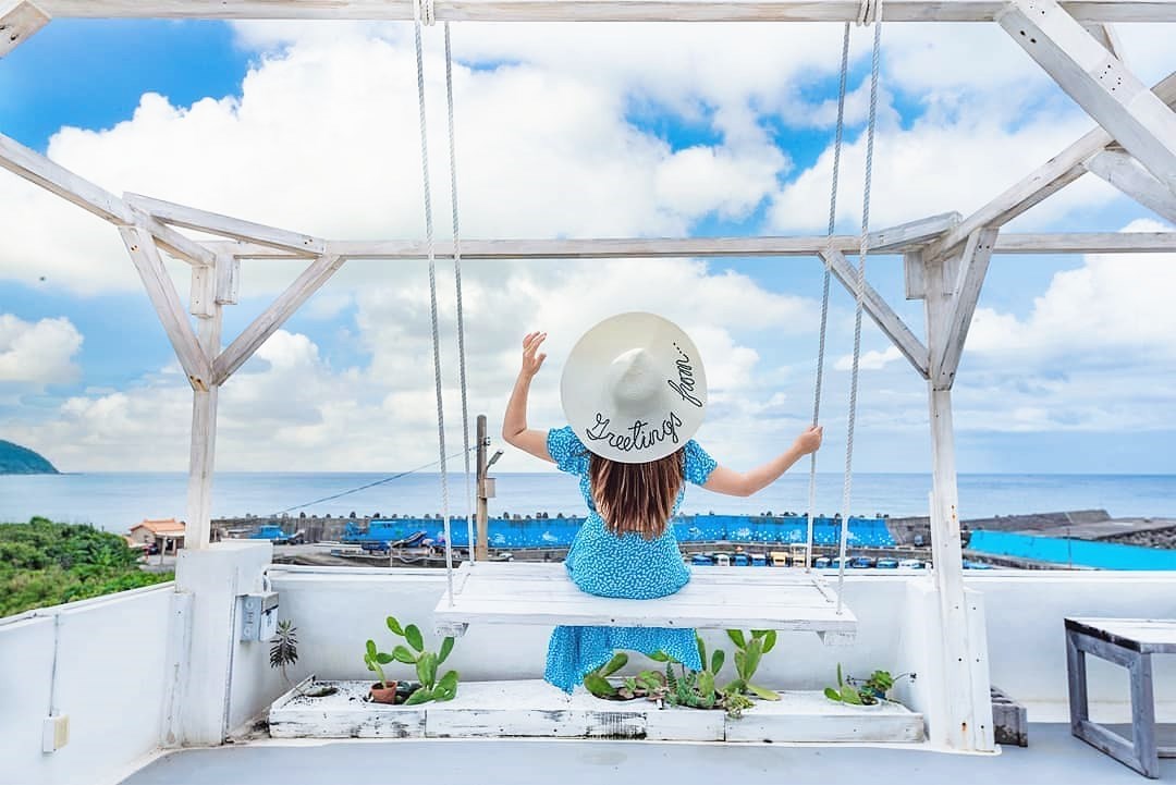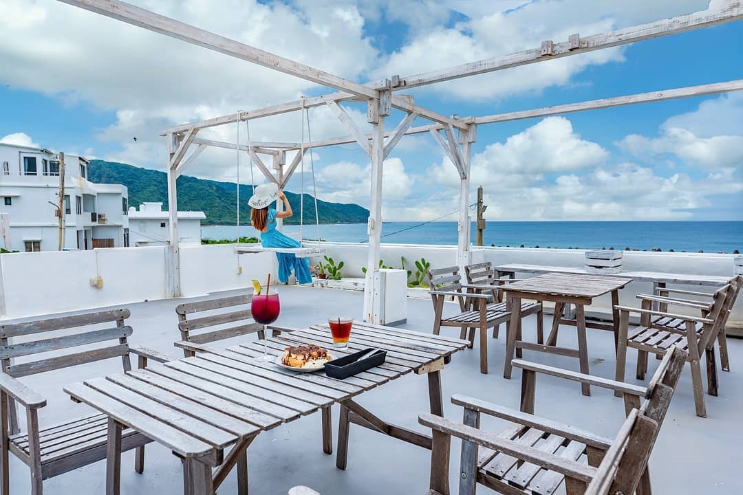 「啞口海藍」位置有點隱密,可以導航「白色領地民宿」到達附近,大約步行三分鐘距離後,從一旁的藍色樓梯走上去,無敵的湛藍海景與一望無際的藍天白雲立刻映入眼簾,搭配木質調簡約設計,令人相當放鬆,室內的座位不多,不用擔心人擠人被打擾,戶外設有露天的座位區,還有浪漫的純白色鞦韆,一邊吹著海風徐徐喝著咖啡,享受愜意的度假時光真是太幸福了!