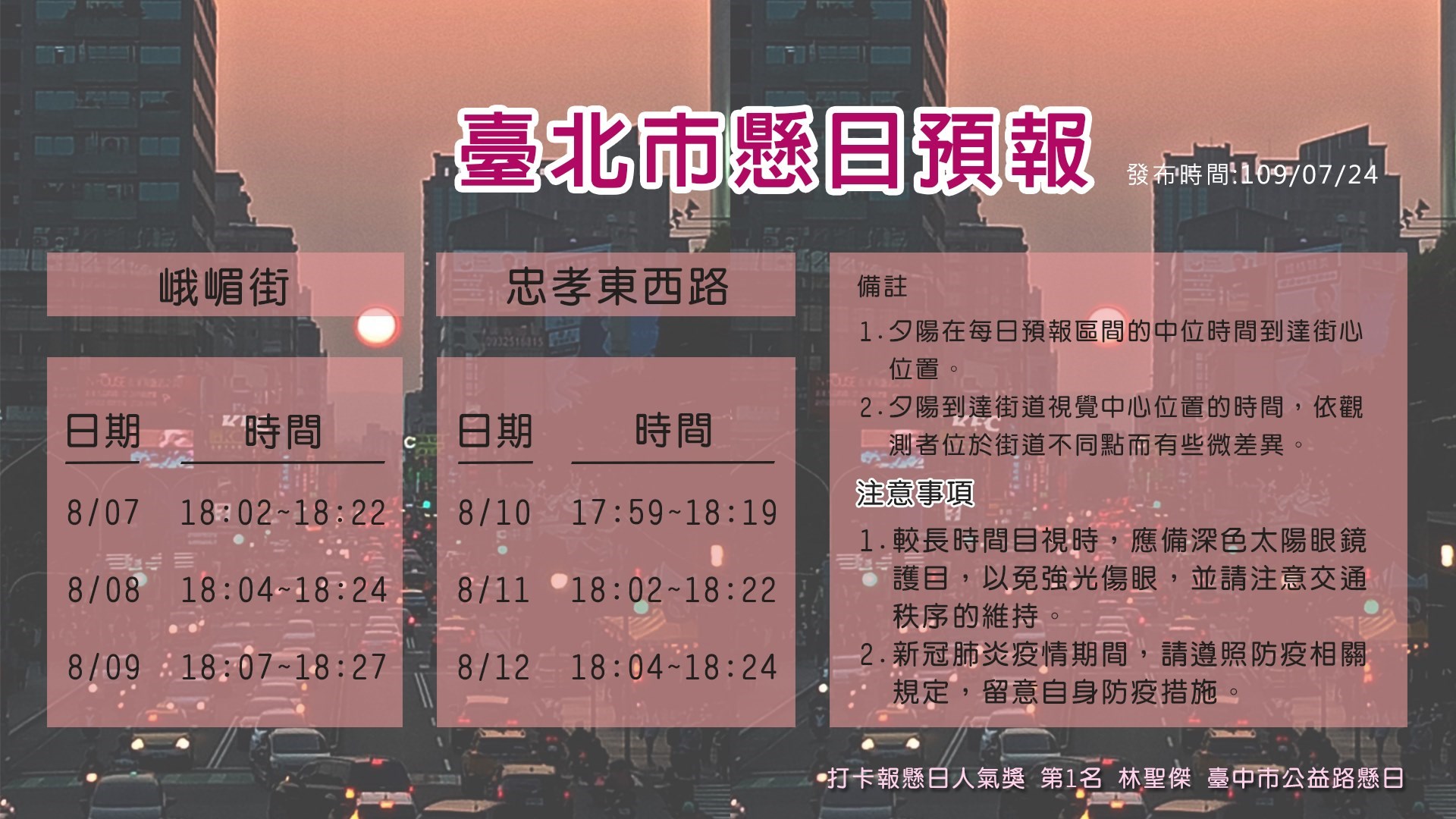 本次登場的台北懸日,將在兩個地方分別登場,除了8月10至12日的忠孝東西路(新生高架以西)外,8月7至9日則是在峨眉街(西寧南路以西),只要是在無雲遮情形下,在傍晚約6點左右,都能看見懸日景象。
