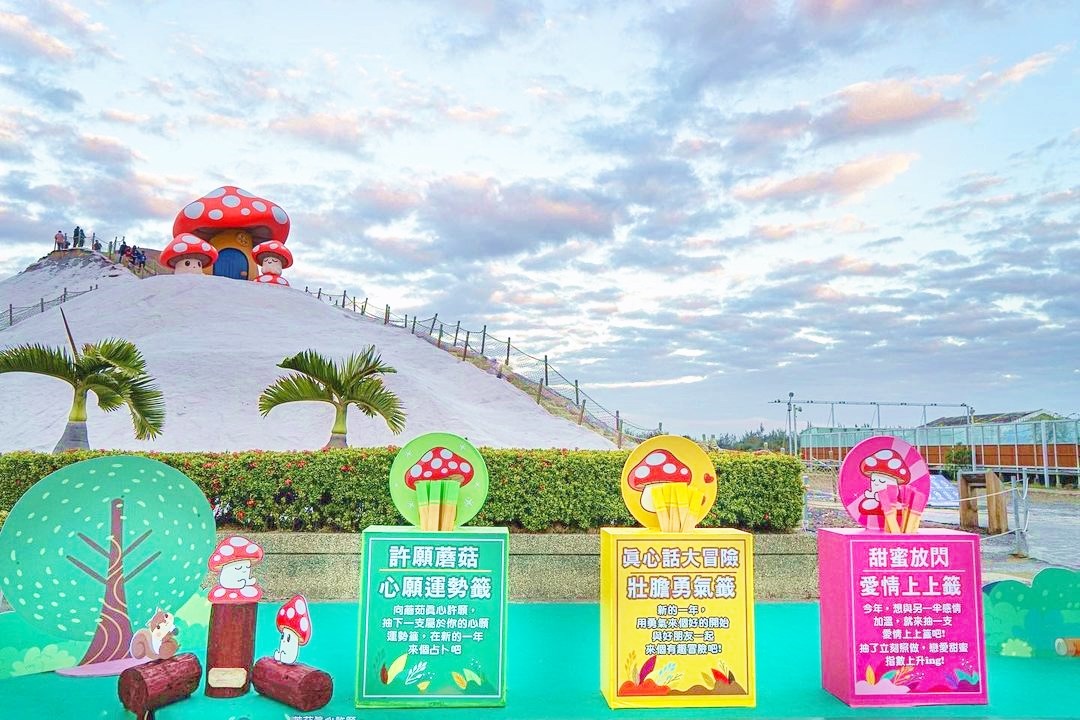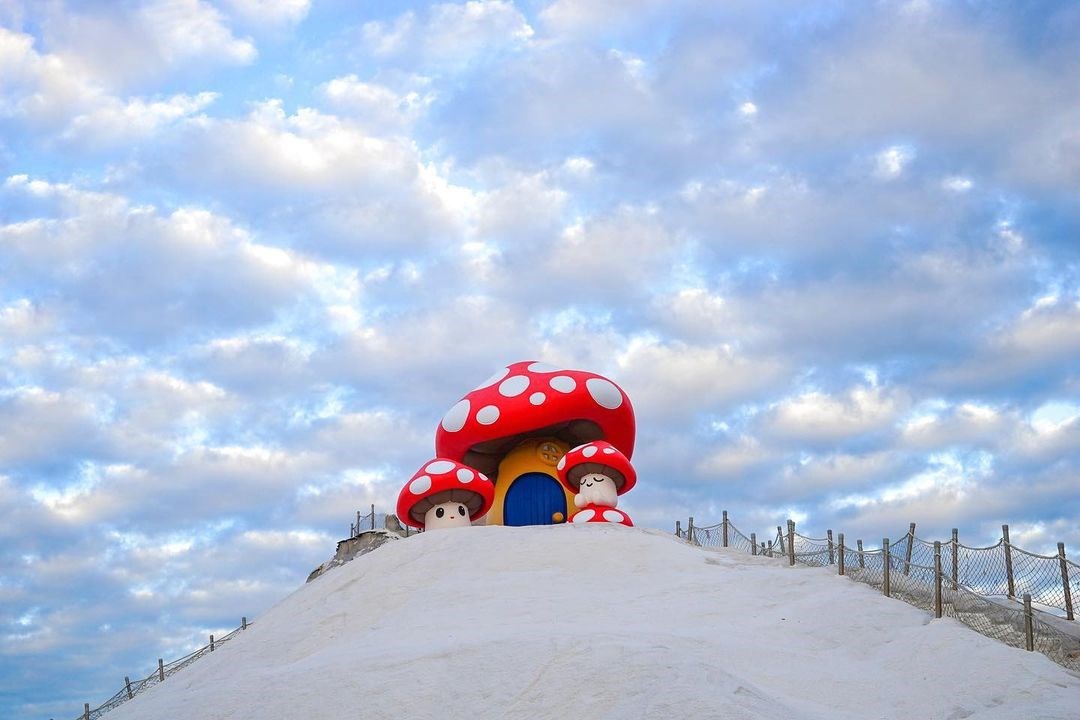 每年年底台南七股鹽山都會打造不同的藝術裝置讓粉絲們免費打卡,今年以「Good!菇菇!」為主題,打造6公尺高的巨型蘑菇,繽紛的色彩座落雪白鹽山,遠遠看就超級吸睛,有不少人都特地停駐腳步大拍美照,相信再過不久又會在IG掀起一股打卡熱潮。