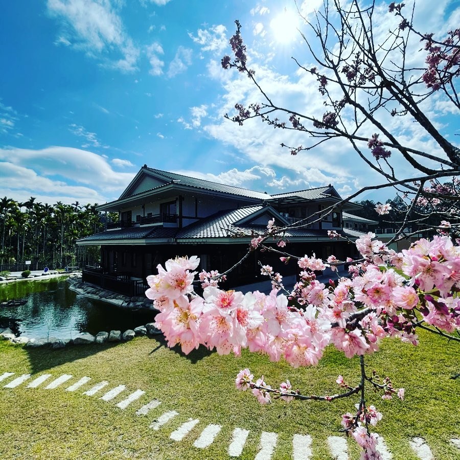 「玄町本二家日式旅宿」除了建築主體充滿濃厚的日本風外從戶外到室內都大走唯美日系風,寬達一甲地的園區植被遍佈,還設有小池子與水上棧道,院子還種植了幾株櫻花木,目前正值花季開的很是迷人,更添不少日本浪漫氛圍。