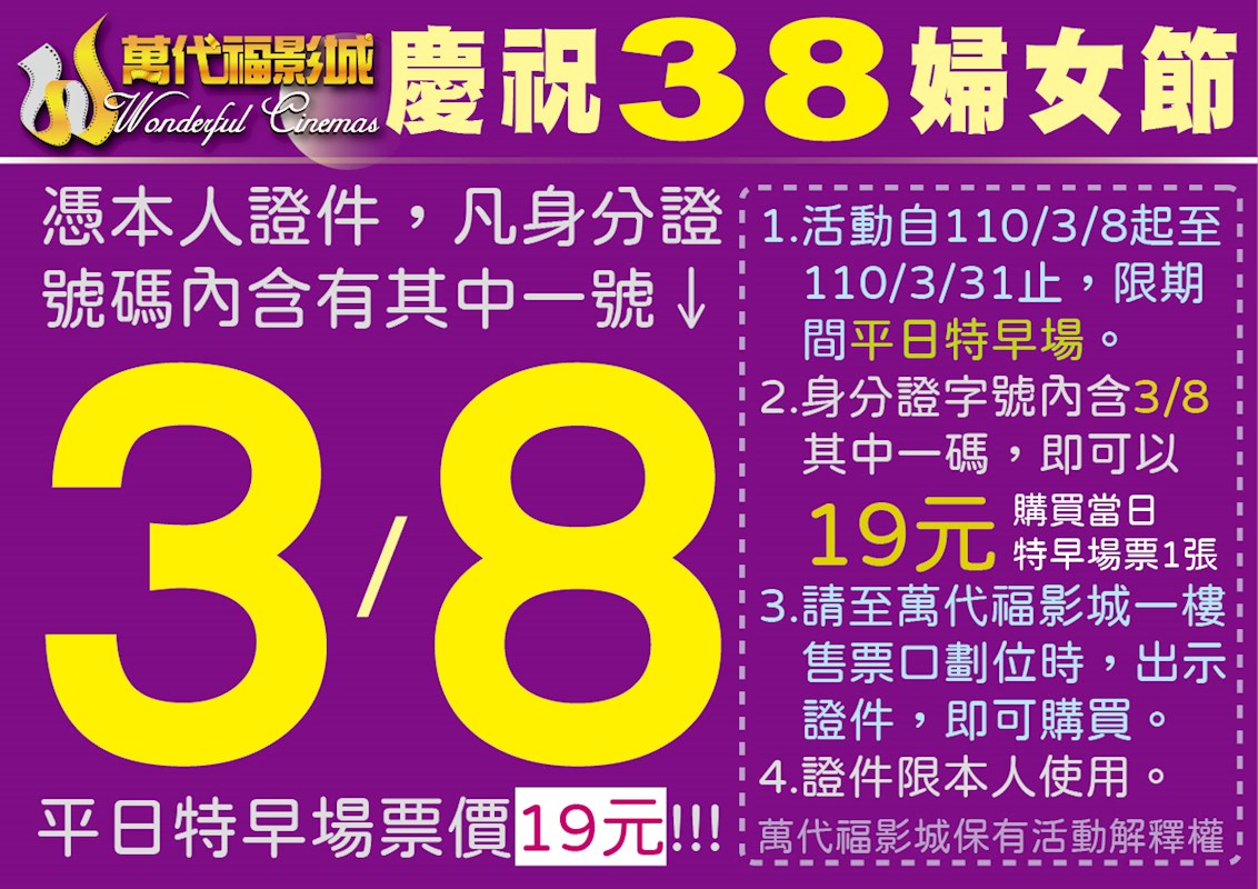老字號二輪片的萬代福影城,則是推出38婦女節優惠,在3/8~3/31日期間,身份證只要有3、8其中一碼,即可用19元銅板價購買當日特早場票一張,快拿出身分證對起來啦!