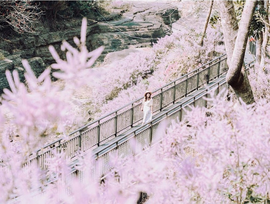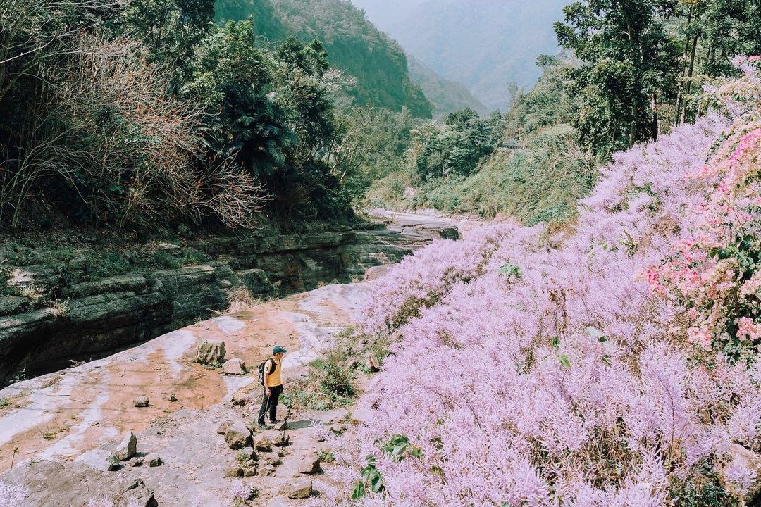 麝香木的花期一般落在2-4月份,最高能夠長到3米,粉紫色的花朵覆蓋翠綠的山林更顯迷人,隨手一拍都超級有意境,還沒朝聖的粉絲可以準備出發拍一波,也提醒大家前往拍照時不要攀折花木或破壞環境,採用借位方式拍起來就很美,此地點高低落差大加上旁邊就是峽谷河床,水深危險,前往時一定要切記多加注意自身安全喔!(下方有地點)
