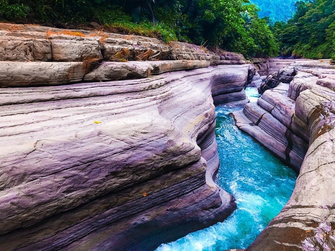 「萬年峽谷」是雲林草嶺的著名景點,經經過千百年下來的沖刷侵蝕,形成壯觀的V字形水道,大自然的鬼斧神工讓人讚嘆不已,奇岩搭上夢幻藍現在周圍還有粉紫色的麝香木爆開一片,畫面美的宛如仙境,加上麝香木本身濃郁的香氣,更是讓人身心靈都超級放鬆。