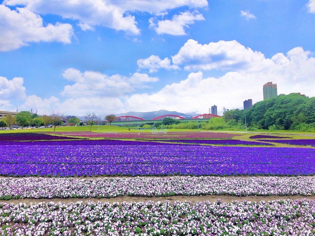 古亭河濱公園種植的其實是一種叫香堇菜的花卉,雖然高度不高不過顏色相當鮮艷,多達13萬株的數量形成夢幻紫色花毯,隨手一拍都是打卡美照,還有一些一串紫及羽葉薰衣草也陸續綻放,光是漫步其中就令人心情大好。