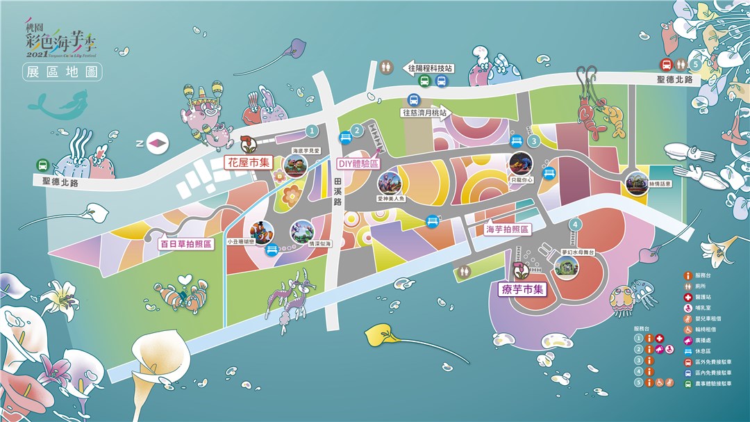 今年廣達5.9公頃的「2021桃園彩色海芋季」,在3/27至4/11於溪海休閒農業區夢幻登場,現場打造的7款大型裝置藝術,由高達5公尺的「愛神美人魚」作為主花毯,加上河豚、小丑魚、海龍、軟絲、龍蝦、水母等海洋生物造景,與6萬株彩色海芋與2萬株百合點綴成的繽紛花海,春天限定的超大型花季怎麼能錯過~