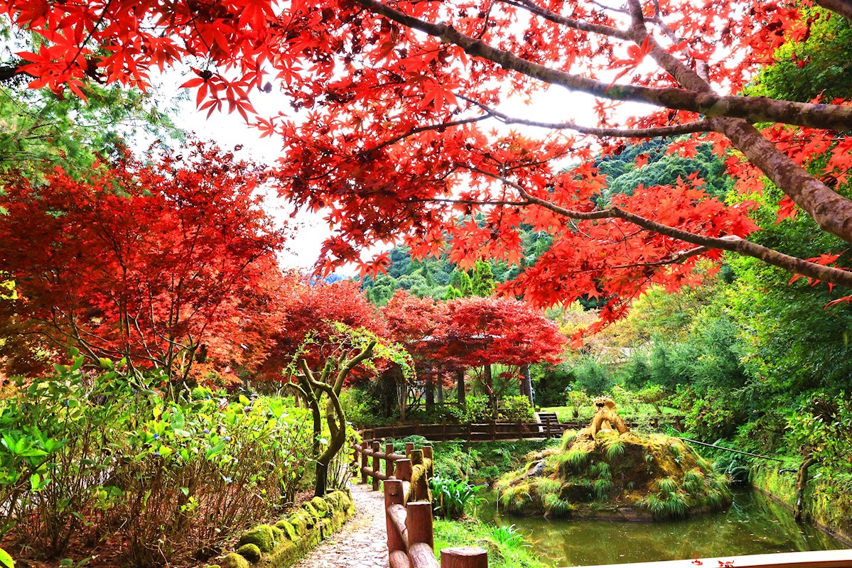 南投的杉林溪森林生態渡假園區,生態豐富植被遍佈,ㄧ年四季都有不同的美景可賞,每年秋季開始園區內近3000棵的楓樹,陸續轉紅,放眼望去一大片楓紅景像很是壯觀,搭上潺潺溪水與層疊山巒,畫面如詩如畫,令人陶醉。