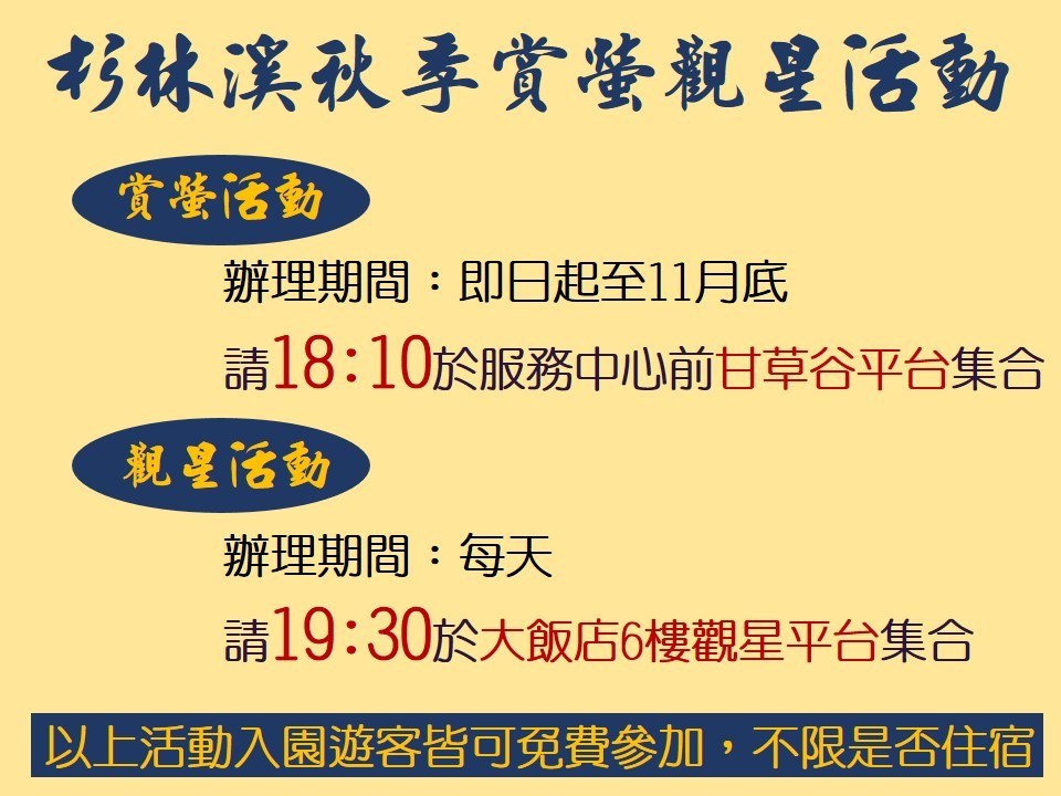 杉林溪也於11月底前,每日的18:10分起,在服務中心前甘草谷平台有賞螢火活動,每天的19:30於大飯店六樓的也有觀星活動,只要是入園遊客都可免費參加(不限是否住宿),白天賞景拍美照,晚上賞螢火蟲看星星,從早到晚都好玩,浪漫約會或是親子行都適合,快收進口袋清單中,找時間到杉林溪走走吧!(下方有地址)