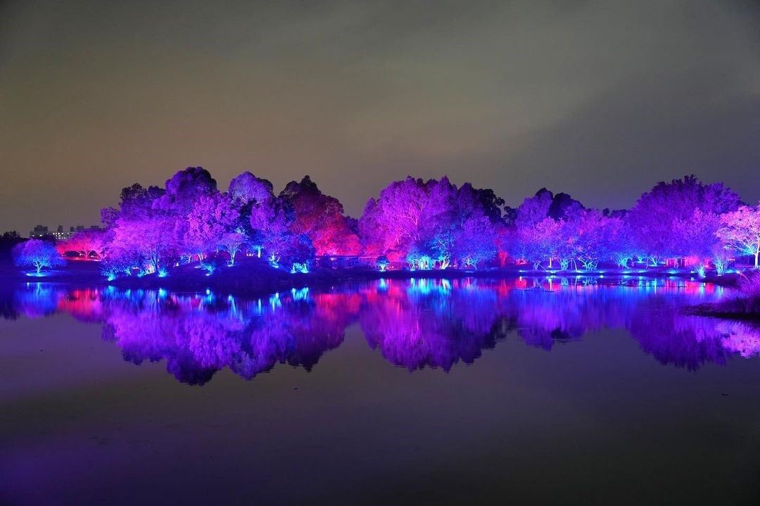 作品《湖映森光》結合公園裡的地形地貌,配合樹木森林與北湖,利用LED燈串打照整座「光環境」,透過森林鏡射湖面的水上倒影,讓粉絲們感受到北湖斑斕色彩波動的氛圍,天然的森林隧搭上光色的溫染,彷彿穿梭在四季變化的時間隧道中,如夢似幻,將帶領粉絲們體驗不一樣的北湖之美。