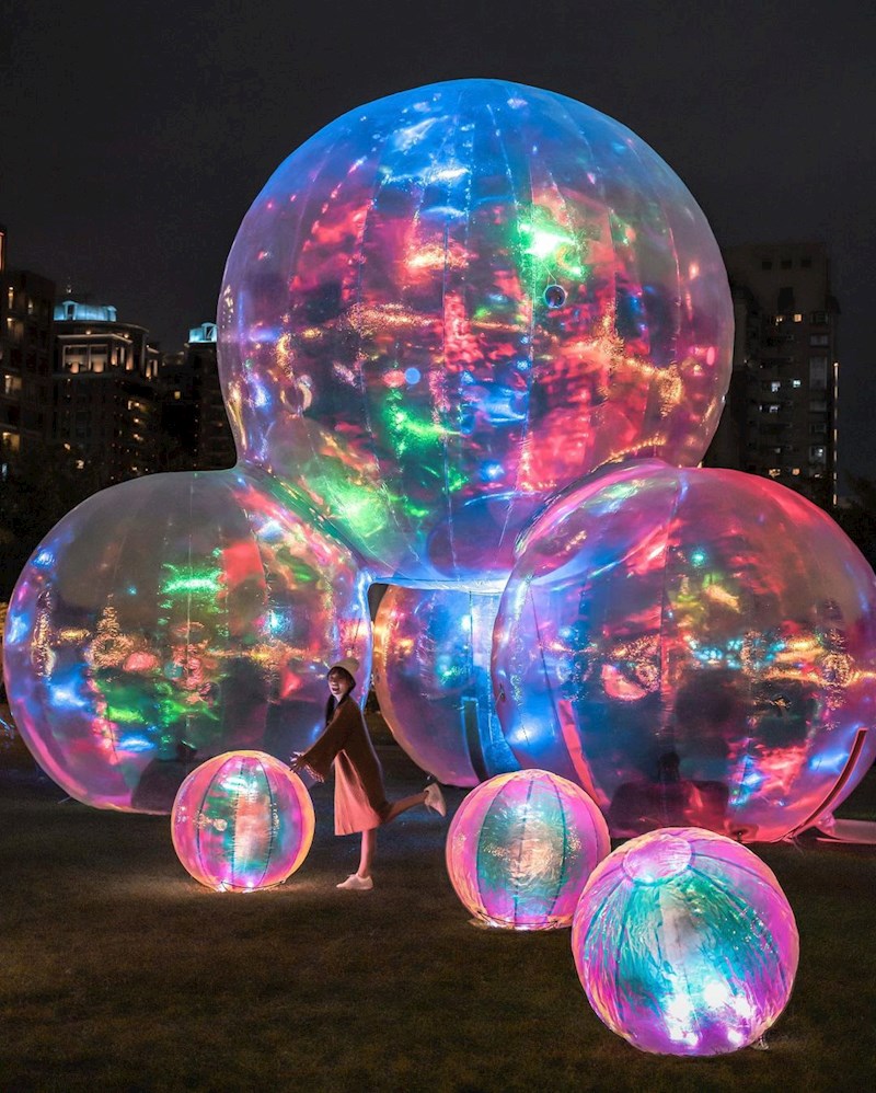 這回登場的「2022臺灣國際光影藝術節」,以「光・舞弄・影」為主題,分為戶外與室內展覽(室內展覽尚未開放),其中最吸睛的,莫過於一眼就能望見,在草地上彷彿被時間定格住的巨無霸彩虹泡泡球,不管是白天的炫彩,還是晚上點燈後的魔幻,都讓人一秒回味童年吹泡泡時的快樂時光~