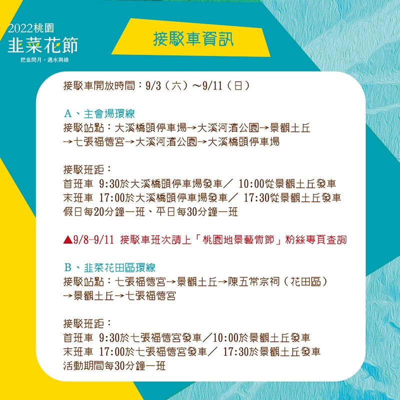要注意因賞花路線道路狹窄不適合車輛進入,請至指定停車場停放車輛再轉搭接駁車(詳細交通資訊顯示于文末),在逛完韭菜花田後,還能順遊月眉休閒農業區、康莊休閒農業區等安排半日遊或一日遊,加上「桃園地景藝術節」同步登場,9月就來桃園玩!