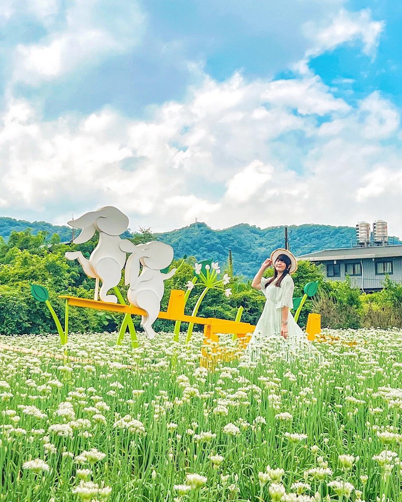 有著北部最大韭菜田的桃園大溪,是每年欣賞九月雪不可錯過的熱門景點之一,今年「2022大溪韭菜花節」以「把韭問月,遇水與綠」為主題,地點選在七張福德宮,一連9天展開各種活動,有農事體驗、小旅行、農創市集等外,還打造多組美拍裝置,如隱藏在花田裡的兔兔蹺蹺板,讓拍照更有意境。
