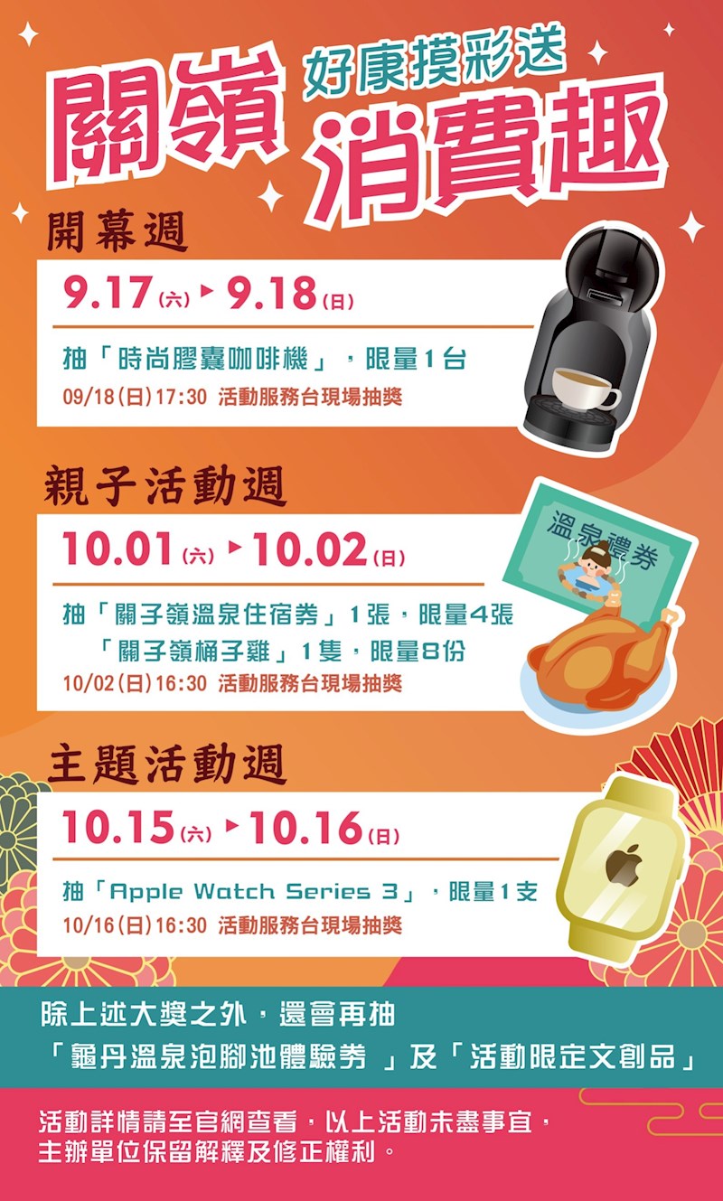 10月份起,主辦單位更是推出多元主題活動,10/15日19:00-21:00時段,在大成殿廣場,還會有「夜祭曉慶、時代職人、時光化妝間、關嶺舊事」等主題活動,動靜皆宜精彩萬分;10/16日15:00-17:00當天還有免費的「尋泉趣」實境解謎活動(預約制),邀請粉絲們組團化身為冒險家一同尋找失落的溫泉寶藏,挑戰成功的隊伍可以獲得萬元獎金,絕對要揪團挑戰起來!