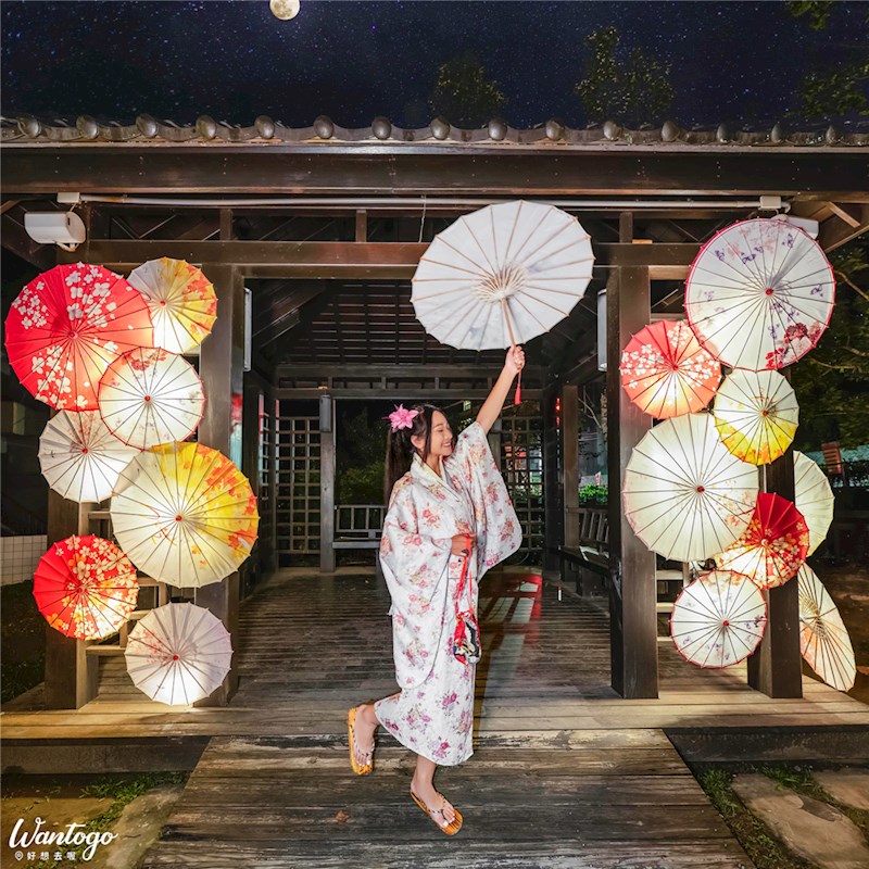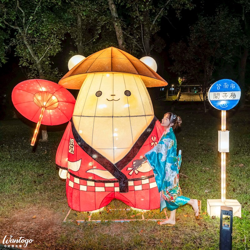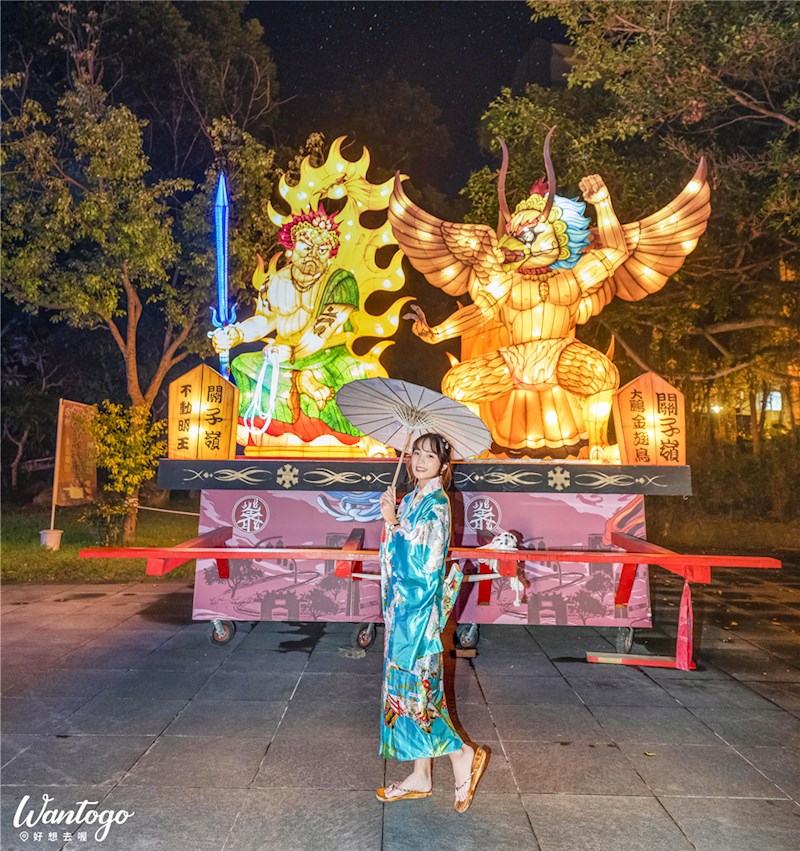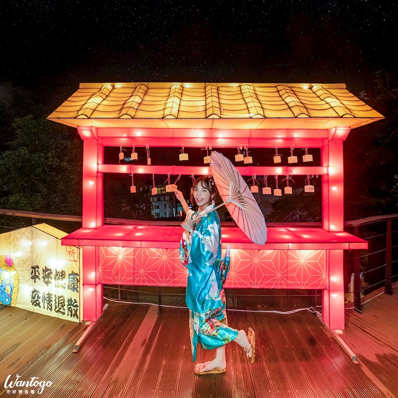 花燈的部分在嶺頂公園、寶泉橋公園、不動明王、大成殿都有不同造型展出,祭典燈車不動明王、大鵬金翅鳥、日式繪馬、燈籠海、巨大熊熊,每一座都超可愛,遠遠看就相當吸睛,夜晚點亮燈光更是迷人,繽紛的紙傘涼亭裝置也是這次必拍亮點之一,來一趟就有發不完的IG美照。
