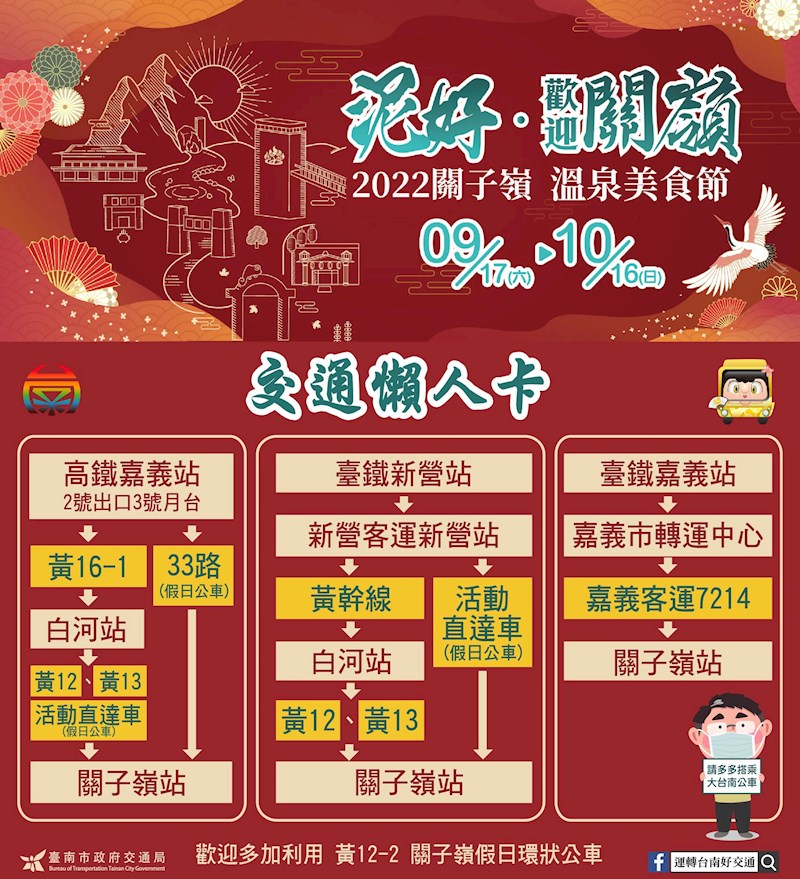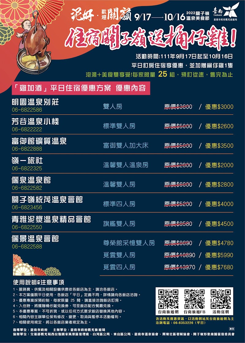 除了一系列精采活動外,關子嶺的「桶仔雞」與「泥漿溫泉」也是來到這裡不可錯過的行程之一,時間充裕的話,也可考慮在關子嶺住一晚,關子嶺溫泉美食節活動,今年與在地業者合作推出平日住宿雞加酒優惠方案,並加碼於「旅行台南APP」加贈商家平日優惠券,此外在活動週假日(10/1-2、10/15-16),前往有參與活動的店家消費就能參加摸彩活動,有機會將Apple Watch、還有時尚膠囊咖啡機、泡湯券、桶仔雞兌換券等多項好禮帶回家。提醒大家,前往時也別忘要佩戴好口罩,並遵守相關的防疫措施,快找時間到關子嶺走走吧!(下方有地址)